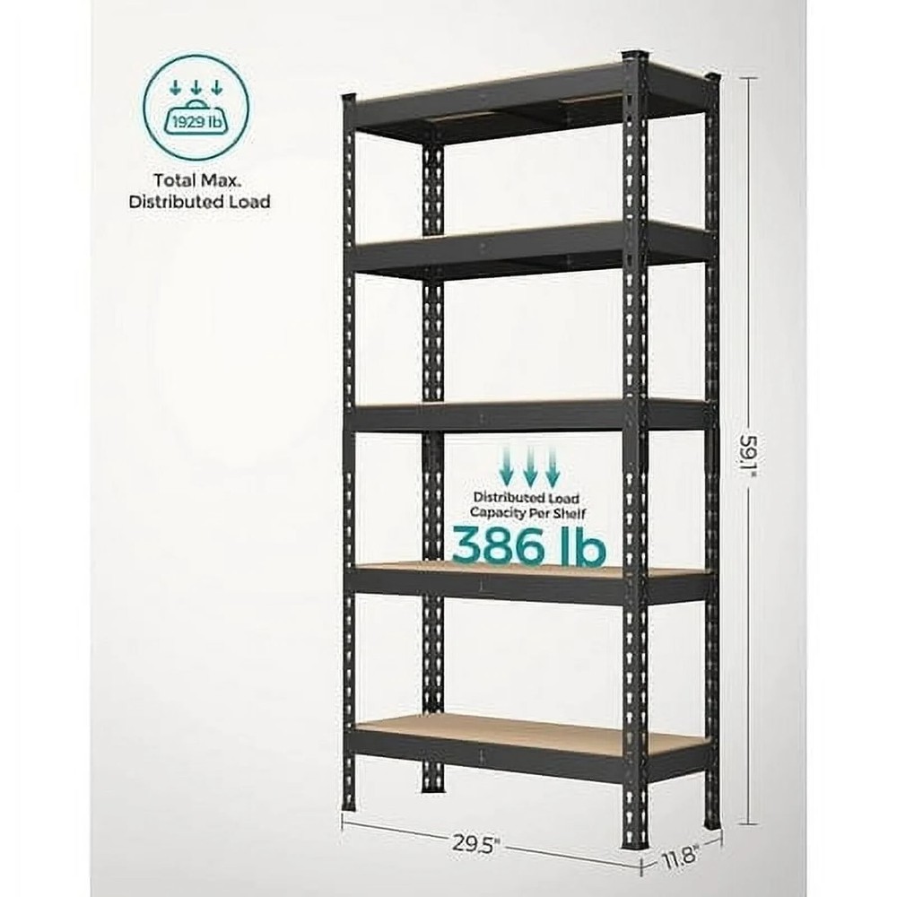Sturdy and High Load Capacity: Built with a durable steel frame and thick MDF panels, each shelf can hold up to 386 lbs, providing a total weight capacity of 1,929 lbs. Reinforced crossbeams add extra stability, ensuring safe and reliable storage for heavy items. Adjustable Shelves for Versatility: Customize your storage with adjustable shelves, allowing you to change the height in 14" increments. Perfect for storing items of various sizes, including boxes, containers, tools, and sports equipment. Easy Boltless Assembly: This shelving unit is designed for hassle-free, tool-free assembly. Quickly get your items organized and off the floor with its bolt-free design, which also makes disassembly and relocation simple. Convertible 2-in-1 Design: Each unit can be divided into two smaller shelves, offering flexible setup options. Use them side-by-side, in an L-shape, or as separate units in different rooms to suit your space and storage needs. Thoughtful Features for Safety: The unit includes protective foot pads to minimize noise and prevent floor scratches. An anti-tip kit is also included for secure wall attachment, enhancing stability and safety. Specifications: Dimensions: 11.8 x 29.5 x 59.1 inches Maximum Load Capacity: 386 lbs per shelf Material: Steel frame and MDF panels Color: Black This heavy-duty shelving unit is perfect for garages, warehouses, basements, kitchens, or sheds, offering reliable and adaptable storage solutions for all your organization needs.