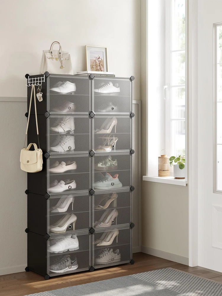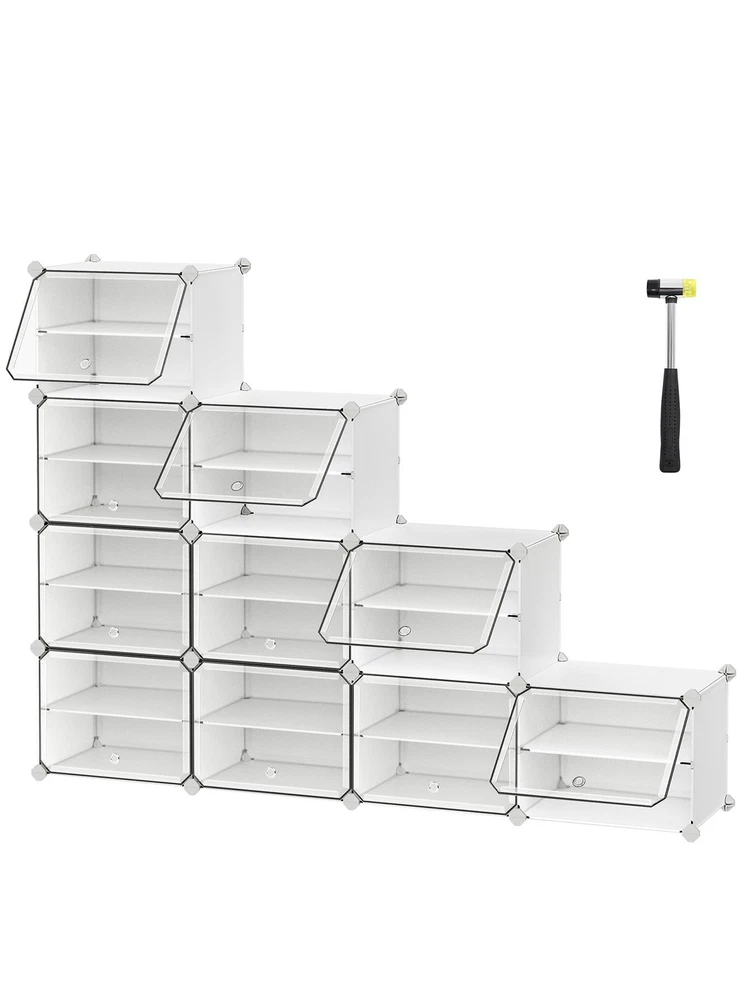About this item [Storage Aplenty] This versatile plastic shoe storage organizer, able to accommodate up to 40 pairs of shoes, doubles as storage for bags and clothing. Its space-efficient side hooks offer a handy spot to hang hats or dog leashes [Robust and Secure] Crafted with premium connectors, durable plastic panels, and strong steel wire, each slot of this shoe storage cabinet holds up to 11 lb. The provided anti-tip kit ensures safe use in living rooms or bedrooms [Easy Assembly and Disassembly] The included rubber mallet makes assembling this shoe rack quick and easy. This organizer can also be quickly disassembled to store or transport, letting you easily rearrange this around your home [Adaptable and Versatile] Configure this storage unit in different ways. Make it have 2 or 3 separate rows, or even divide it into 2 small shelf units to organize shoes, clothes, or toiletries in your entryway, bathroom, or any other desired space [Ventilated and Easy to Clean] This plastic shoe cabinet features clear doors, providing dust-proof and waterproof protection while allowing easy viewing of shoes inside. Grommets on the doors enable effortless opening and promote ventilation Specifications: Material: ABS Plastic Connector, PP Plastic Panel, Steel Frame Product Size: 12.6"D x 32.7"W x 61.4"H (32 x 83.1 x 156 cm) Interior Size of Each Compartment: 11.8"D x 15.7"W x 11.8"H (30 x 40 x 30 cm) Product Weight: 21.2 lb (9.6 kg) Max. Static Load Capacity per Compartment: 11 lb (5 kg) Total Max. Static Load Capacity: 110 lb (50 kg) Package Contents: 10 x Plastic Panel with Grommet (15.7" x 11.8") 34 x Plastic Panel (15.7" x 11.8") 15 x Plastic Panel (11.8" x 11.8") 2 x Anti-Tip Device 34 x Joint 40 x Plastic Connector 1 x Wire Panel with 5 Hooks 1 x Rubber Mallet 1 x Instructions SONGMICS Notes: For safety, be sure to secure the shoe rack to the wall with the included anti-tip kit. Children are not allowed to climb on or play with the shoe storage cabinet for safety. Do not overload this shoe storage organizer. Do not place the storage unit outdoors for a long time to avoid weathering. Keep the rounded sides of the plastic connectors marked "SONGMICS" facing outwards during assembly. During assembly, ensure that the corners of the panels are fully inserted into the bottom of the connectors for greater stability. Material: Stainless Steel