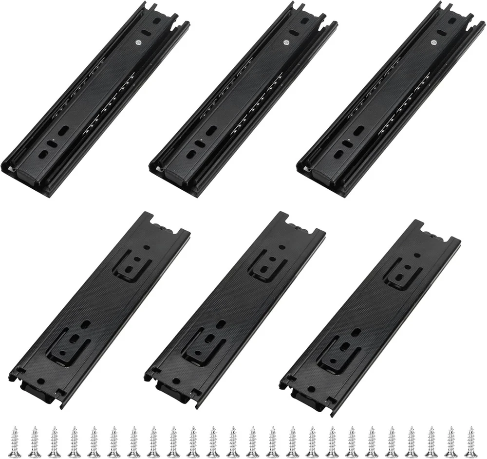 SOUJAP 6 PCS 8 Inch Full Extension Drawer Slides, 8 x 1.8 x 0.5 inch, Black Product Details Drawer Type: Ball Bearing Slide, Side Mount Manufacturer: SOUJAP Number of Items: 6 Part Number: 2302006 Item Weight: 2.59 pounds Product Dimensions: 7.87 x 1.77 x 0.49 inches Item model number: 2302006 Size: 8 x 1.8 x 0.5 inch Finish: Powder Coated Included Components: 6 x 8 inch drawer slides Batteries Included?: No Batteries Required?: No Color: Black Material: Alloy Steel Brand: SOUJAP Finish Type: Powder Coated Mounting Type: Side Mount MATERIAL - Our telescopic drawer slides are made of cold rolled steel material, carefully designed and manufactured, making them very smooth and quiet when parallel, making them the best choice for drawer slides. SIZE - Our packaging includes a total of 6 pieces of side mount drawer slides, totaling 3 pairs, each measuring 8 x 1.8 x 0.5 inches / 200 x 45 x 12.5mm, with an extension length twice that of when closed. EASY TO INSTALL - Each 8 inch drawer slides is also equipped with screws. You only need to align the pulley with the inside of the drawer and fix it with screws, and it is equipped with a shackle to easily and quickly connect or remove both slide rails. The slide rail is also designed with a self locking switch inside, which can effectively prevent automatic opening. WIDELY USED - When your furniture has been used for too long and the drawers are not sliding smoothly, our telescopic ball bearing slide is your best choice. It can also be widely used in kitchen cabinets, offices, shops, and bedrooms. HASSLE-FREE SHOPPING - Once you purchase our 8 inch drawer slides, you are entitled to a 30 day worry-free refund. Or if you have any questions or doubts about the product, please feel free to email us. We will get back to you as soon as possible. Description ABOUT US:We are committed to providing our customers with brand new and useful products. Customer satisfaction is backed by high quality products and perfect after-sales service. We take this as our company guideline. Try shopping at SOUJAP now, we won't let you down! PRODUCT FEATURES:1.The telescopic drawer slides is made of cold rolled steel material, which is sturdy, durable, and has a longer service life. 2.You will receive 6pcs side mount drawer slides, each measuring 8 x 1.8 x 0.5 inch / 200 x 45 x 12.5mm. 3.The installation of the 8 inch drawer slides is very simple, and it is equipped with a quick buckle, making connection and disassembly very convenient. 4. The telescopic ball bearing slide can be widely used in kitchen cabinets, drawers, office tables, and more. SPECIFICATIONS: Material: cold rolled steel Size: 8 x 1.8 x 0.5 inch / 200 x 45 x 12.5mm Color: black Quantity: 6 x 8 inch drawer slides