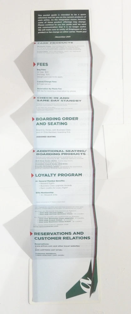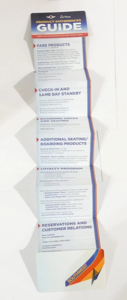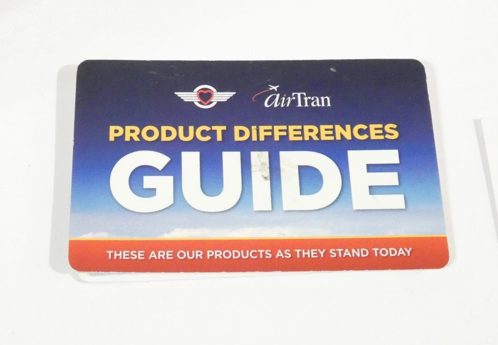 SOUTHWEST AIRLINES AIRTRAN FROSTY TOWEL NIP SOUTHWEST AIRLINES AIRTRAN PRODUCT DIFFERENCES GUIDE Accordion folded and unfolds to reveal the differences between the two airlines. Measures 3 1/4 x 2 inches when folded Shipping $4.95 I will combine auctions for a better shipping price Payment expected within 4 days. Contact me with any questions you may have See my other auctions for more airline items and Golf shirts PLEASE NOTE: ebay CUSTOMER'S may be charged INTERNET SALES TAX by states with that requirement. International shipping via eBay's International Shipping Services.