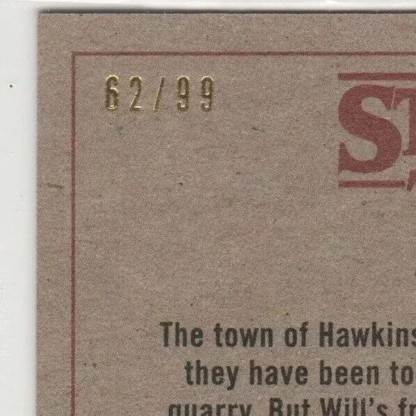 Card Type: trading card Genre: Adventure, Sci-Fi, TV & Movies Print Run: 99 Country/Region of Manufacture: United States Parallel/Variety: Blue UPC: Does not apply Descriptive: sci-fi action adventure supernatural drama series tv television Features: Base Set, Chase, Insert, Parallel/Variety, Serial Numbered, Short Print Language: English Manufacturer: Topps ID: American Pop Cult Series: 2018 Topps Netflix Stranger Things Season One 1st Series 1 TV Show: Stranger Things Original/Licensed Reprint: Original Material: Card Stock gtin13: Does not apply Autographed: No Card Size: Standard Type: Non-Sport Trading Card Set: Series 1 Relevant Keywords: Millie Bobby Brown Eleven Winona Ryder David Harbour Franchise: Stranger Things Year Manufactured: 2018 Vintage: No