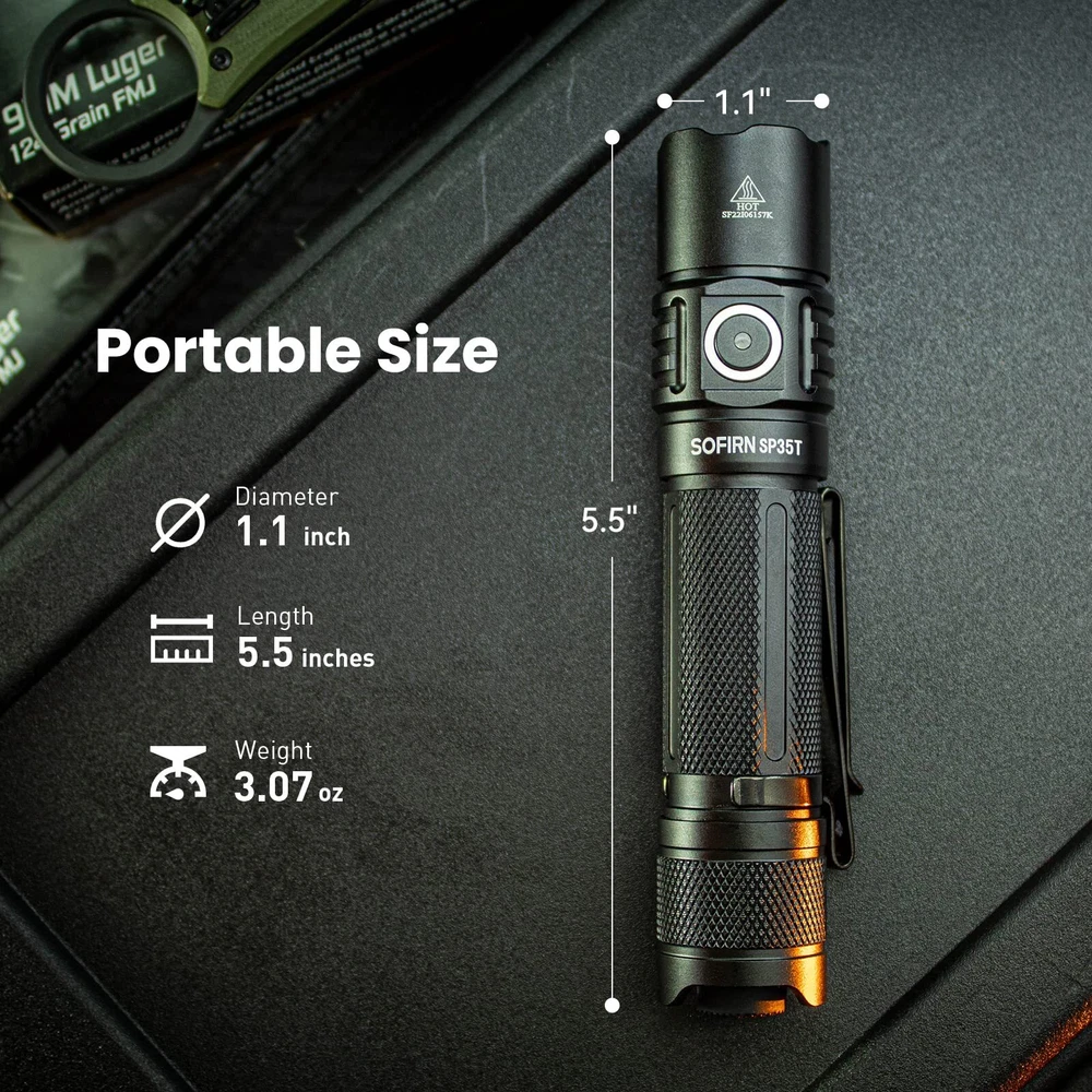 HIGH PERFORMANCE: SP35T has a max 3800-lumen output in a 280 meters(918 ft) beam distance. As an upgraded version of SP35, this bright flashlight has an excellent balance of flood and throw. Perfect for dog walking, home security, camping, and hiking QUICK ACCESS: SP35T has quick access to the turbo, strobe, and eco, making it more useful in emergencies. And for daily use, this led rechargeable flashlight has general lighting mode and tactical mode, readily meeting all your illumination needs USB C CHARGING & LONG-LASTING: This rechargeable flashlight features a built-in USB C port which allows you to charge it directly and conveniently. After fully charged, this USB flashlight can run for six hours and fifty-eight minutes at the medium mode of a non-diminishing brightness HIGH QUALITY: This camping flashlight is rated IPX8 water-resistance and has a hard-anodized aluminum body. Its upgraded buck driver lets it control the temperature better when you need ultra brightness for long time. SP35T—a reliable flashlight ready for all situations WHAT YOU GET: 1x SP35T flashlight(5500K-6000K), 1x battery(inserted, please unscrew the tail cap, remove the insulating paper before using), 1x TypeC charging cable, 1x manual, and helpful customer service