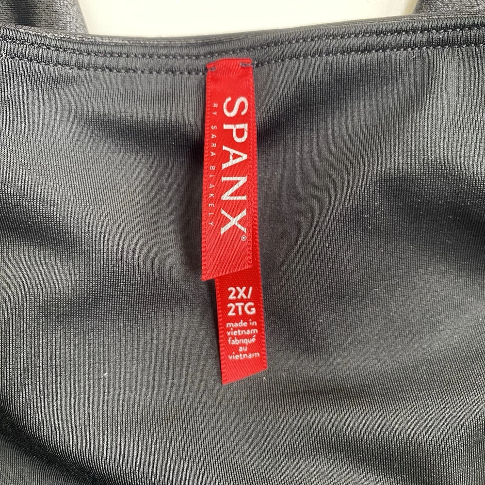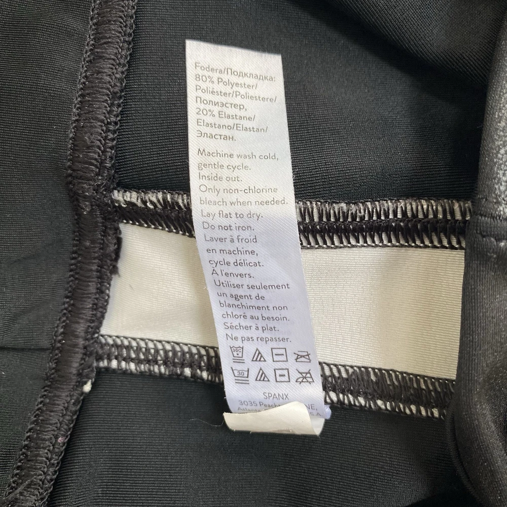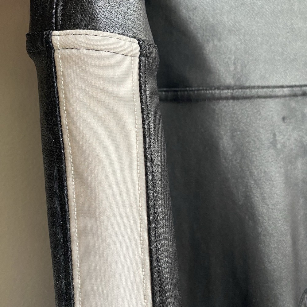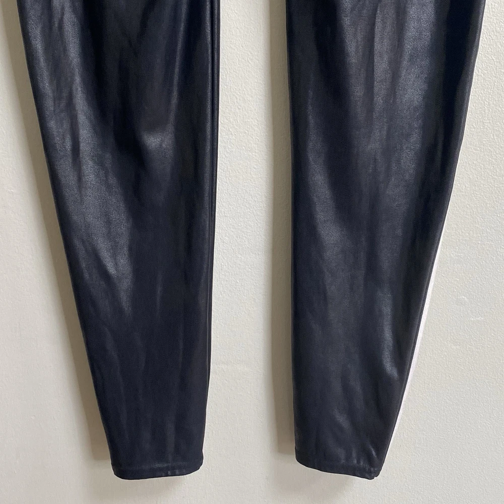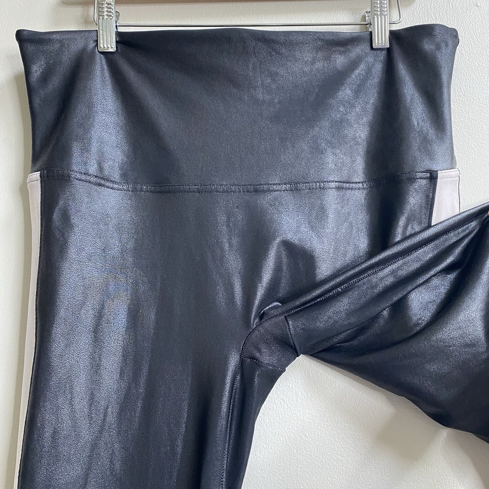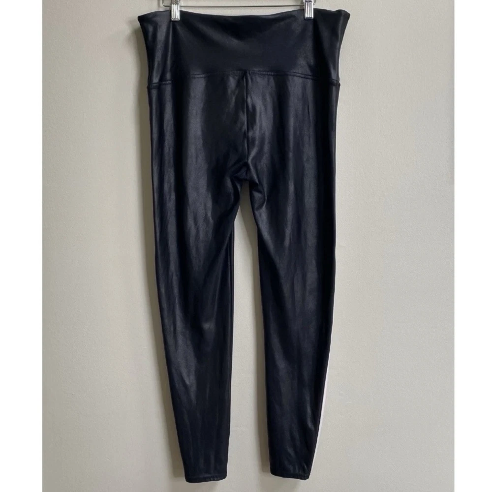 In Faux Leather leggings, you're everyone's asspiration! Designed with the SPANX contoured Power Waistband, these leggings give you a flat gut and a GREAT butt. The flattering high-gloss fabric is a total compliment magnet and keeps you ultra-comfortable. Black color with white side tuxedo leg stripe. Faux leather coated stretch knit fabrication. Pull-on. Color: Very Black / White Size 2X Measures Flat Approximately: 17.5" Waist, 11.25" Rise, 26.5" Inseam 87% Nylon / 13% Coated Elastane Sides: 75% Polyester / 25% Elastane Machine Washable **These leggings are preowned, and show normal wear! No stains or holes! Some flaring to the top of the waistband! There is some discoloration on the stripes from the polyurethane coating! SEE PICTURES! Good Condition!**