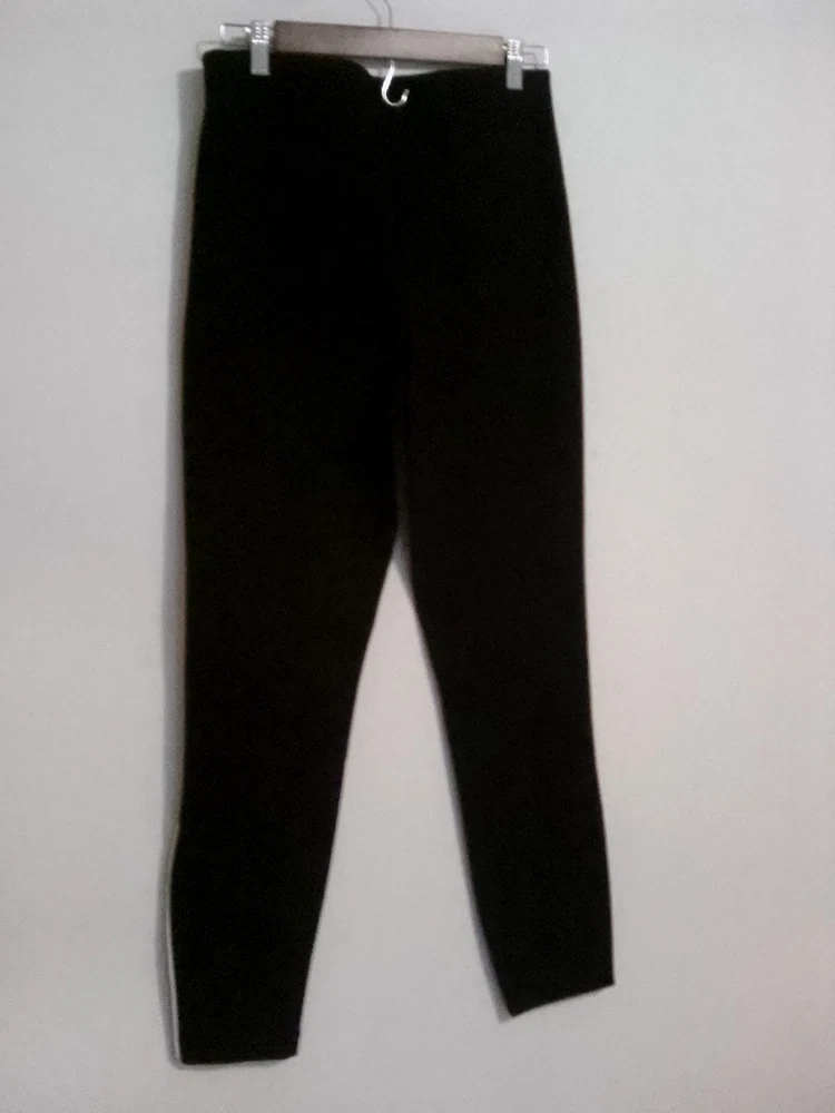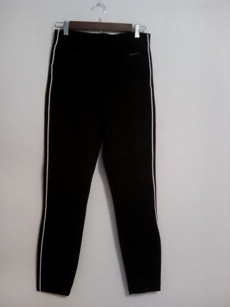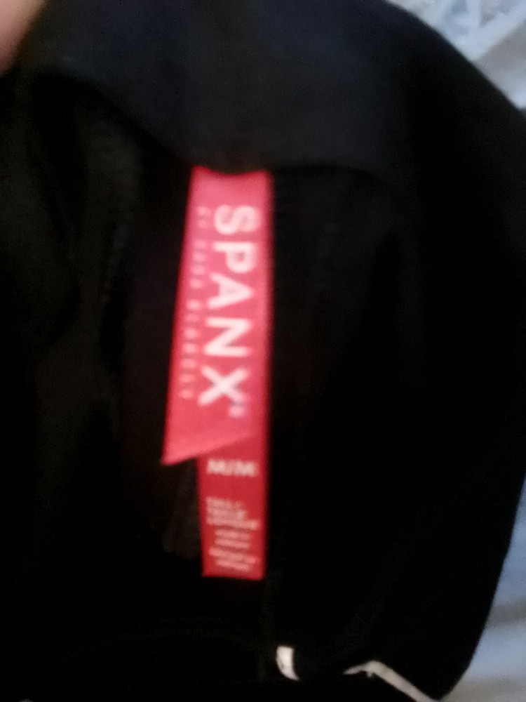 The product is a pair of Spanx leggings in black and white, size medium tall. It has a compression waist and is made of nylon and spandex. The leggings are suitable for various occasions such as travel, activewear, party/cocktail, casual, workwear, and business. It has a mid-rise with an inseam of 18.5 inches and a waist size of 25.5 inches. The garment care is machine washable. The leggings are designed for women and are suitable for gym and training, walking, riding, golf, dance, and yoga. Accent zipper pockets compression waist white stripe. New with rip tag. Excellent condition.