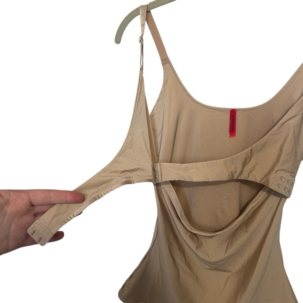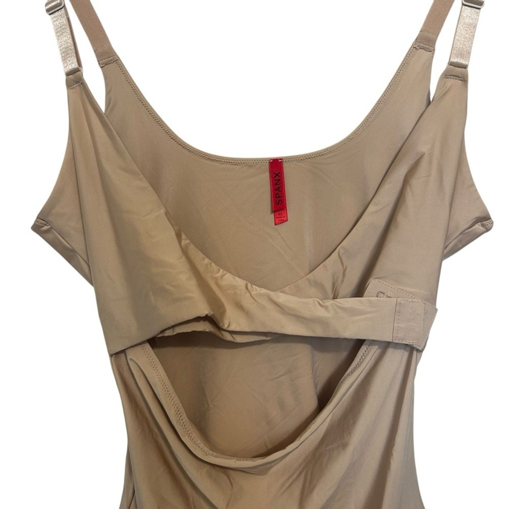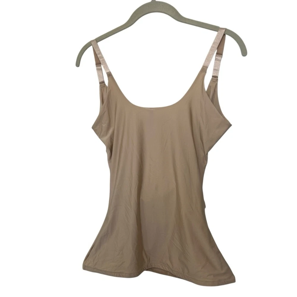 Women’s slimming tank, cami, shapewear SPANX Front crisscross adjustable closure Adjustable straps Tan, beige color Size XL Anti roll, clear rubber on underside of of hem SPANX material creates a slimming silhouette Excellent like new condition- bought but never wore