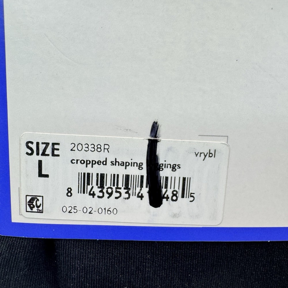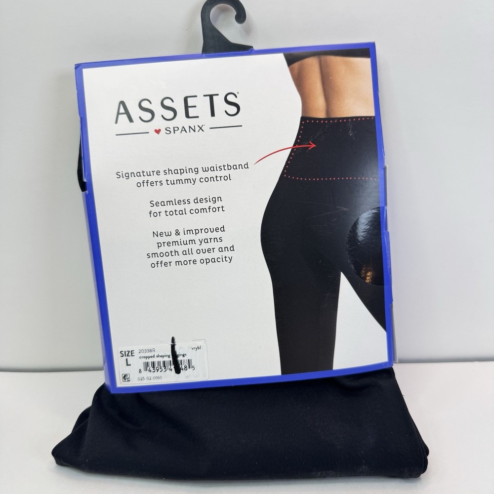 The product is a pair of Women's SPANX Assets Cropped Shaping Leggings in Black, size L. These leggings are designed by Assets by Spanx and are specifically tailored for women with a regular size. The solid black color and cropped style provide a sleek and modern look, while the shaping feature helps to smooth and contour the figure. With a waist size range of 33.5" - 35.5", these leggings offer a comfortable and flattering fit for a range of body types. Waist: 33.5”-35.5” Hips: 41”-43”