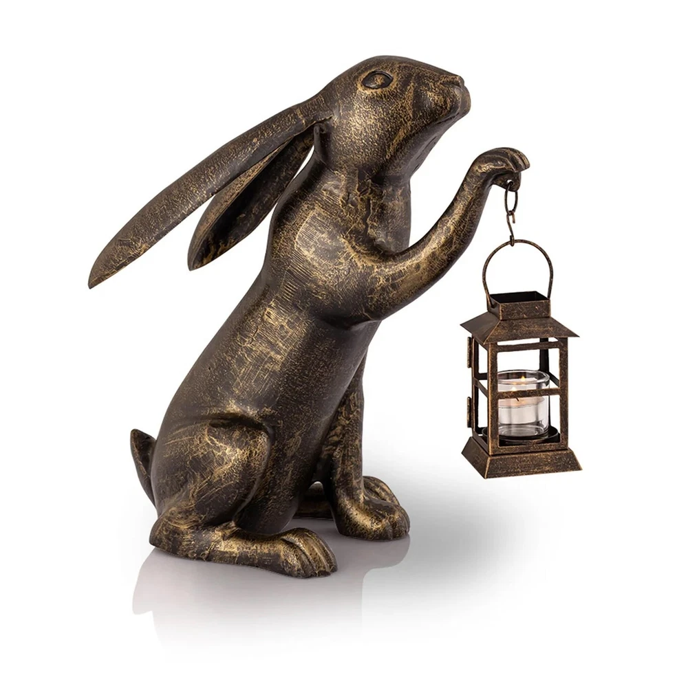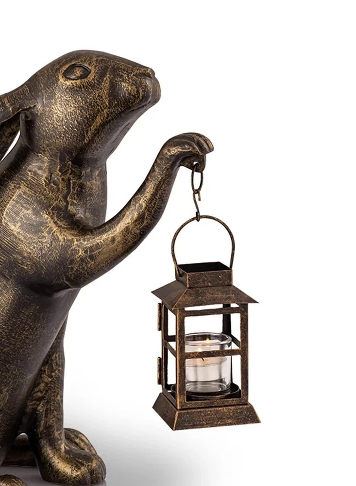 Enhance your indoor or outdoor space with this captivating cast aluminum statue, featuring a long-eared bunny surveying its domain in the warm glow of a nearby lantern. The lantern doubles as a candle holder, accommodating pillar candles up to 3 inches in diameter (ideal for LED candles). With hand-painted accents and a striking patina, this statue exudes timeless charm. Measuring 16.5 inches in height, 15 inches in length, and 9 inches in width, it's a delightful addition to any setting. Whether gracing your garden, porch, or living room, this statue infuses a touch of whimsy and sophistication. Illuminate your space with its enchanting presence, whether by day or night, and let its unique character spark conversations and admiration. Our eBay Store About Us Add to Favorite Sellers SPI Home Cast Aluminum Big Bunny Garden Lantern Candle Holder Statue Outdoor Décor Measures 16.5 Inches High, 15 Inches Wide, 9 Inches Deep Made of Aluminum Beautiful Patina Makes a Great Gift Enhance your indoor or outdoor space with this captivating cast aluminum statue, featuring a long-eared bunny surveying its domain in the warm glow of a nearby lantern. The lantern doubles as a candle holder, accommodating pillar candles up to 3 inches in diameter (ideal for LED candles). With hand-painted accents and a striking patina, this statue exudes timeless charm. Measuring 16.5 inches in height, 15 inches in length, and 9 inches in width, it's a delightful addition to any setting. Whether gracing your garden, porch, or living room, this statue infuses a touch of whimsy and sophistication. Illuminate your space with its enchanting presence, whether by day or night, and let its unique character spark conversations and admiration. Product Details Color bronze Height 16.5 Length 15 Weight