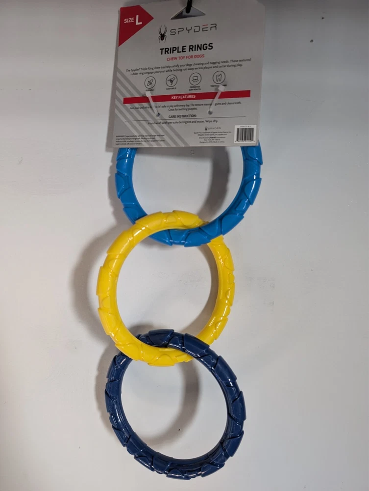 The SPYDER Triple ring chew toy is designed for dogs and serves as a durable teething aid made of rubber. Its triple ring structure makes it easy for dogs to hold onto while providing a satisfying chewing experience. The chew toy is suitable for helping with teething and promoting dental health, offering a long-lasting and engaging playtime for your furry friend. Made in China, this SPYDER chew toy is a reliable option for pet owners looking for a high-quality and engaging toy for their dogs.