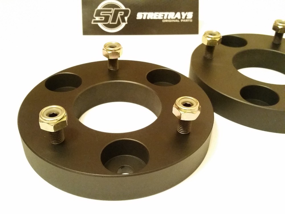 StreetRays [Originals] 1.5" Front Leveling Spacer Lift Kit for 04-24 Nissan Titan 2WD & 4WD BLACK (Made in USA) CNC Machined Finished (All Around) Color: BLACK Application: For 04-24 Nissan Titan 2WD & 4WD Our Kit Includes: 2 x CNC Machined Strut Spacers 6 x Matching Nuts & Studs for easy installation StreetRays [Originals] parts are 100% machined right! here in Central Texas. Matched with the best hardware which is also sourced here in USA. Quality material & precision machining is the main ingredients of all our parts. StreetRays [Originals] lift kit will raise the front of your Titan/Armada truck by an actual 1.5". Our kit can be installed in about 1-2 hours with basic tools. Our spacers are CNC machined out of 6061 T6 billet aluminum in Central Texas. This kit is the fastest and also the most inexpensive way to raise the sagging front end of your pickup or SUV. And we can assure you that our spacers are the strongest on the market and come with 100% satisfaction guarantee and full warranty. This kit will allow 32" size tires (for 2WD models) and 34" tires (for 4WD models) with factory set back rims. Our kit will also include all the correct hardware and a general instruction. We recommend professional installation if you don't have the correct set of tools. IMPORTANT NOTE: The lift spacer thickness and final lift amount is Not a 1 to 1 ratio due to the suspension geometry.