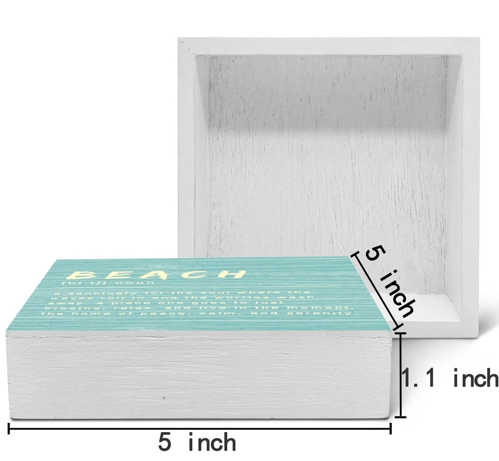 SRADMO Beach Sign Wood Box Sign Desk Decor, Coastal Decor, Beach Decorations For Home, Light Blue Decor, Beach House Wooden Box Sign Decoration, Beach Room Decor, Ocean Theme Gifts Shelf Table Decor Product Details Color: Turquoise Brand: SRADMO Recommended Uses For Product: Beach-themed home decor, bedroom, living room, office decor Product Dimensions: 5"L x 5"W Style: Modern Brand Name: SRADMO Recommended Uses For Product: Beach-themed home decor, bedroom, living room, office decor Style Name: Modern Color: Turquoise Item Dimensions L x W: 5"L x 5"W Perfect for anyone who loves rustic and natural decor, this wooden box sign makes a perfect present, its durable construction making it a practical and stylish addition to any home. It have a classic wooden finish and considerably more intriguing when interesting content is combined with striking designs that make it a beautiful piece that will complement any interior style. This wooden box sign is a good gift choice, It is perfect suitable for birthdays, holidays, Christmas, weddings, or anniversaries or any special occasions. It can be used to enhance the aesthetics of any space, whether it's a bedroom, living room, or office. The size of this wooden box sign is 5*5 inches. This beautifully crafted wooden box sign that is perfect for decorating your home or for use as a unique gift for friends and loved ones.