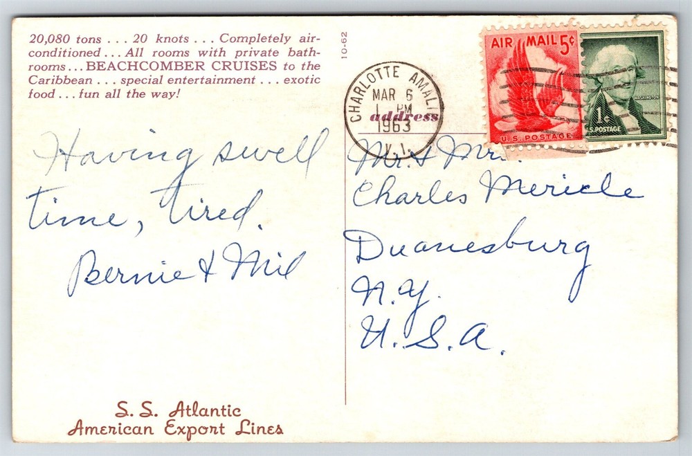 SS Atlantic American Export Lines Beachcomber Cruises C1939 Postcard G5 Thank you for visiting! This is a standard size postcard, 3.5" X 5.5". In stock, usually ships within 24 hours of your purchase. Please ask questions if you are unsure about anything. Our goal is for your complete satisfaction with the postcard and your experience. Check all my other listings in my store. RETIREDWITHBOOKS Powered by SixBit's eCommerce Solution