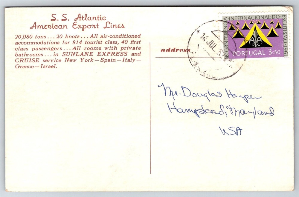SS Atlantic American Export Lines Cruise Ships New York Europe C1939 Postcard G5 Thank you for visiting! This is a standard size postcard, 3.5" X 5.5". In stock, usually ships within 24 hours of your purchase. Please ask questions if you are unsure about anything. Our goal is for your complete satisfaction with the postcard and your experience. Check all my other listings in my store. RETIREDWITHBOOKS Powered by SixBit's eCommerce Solution
