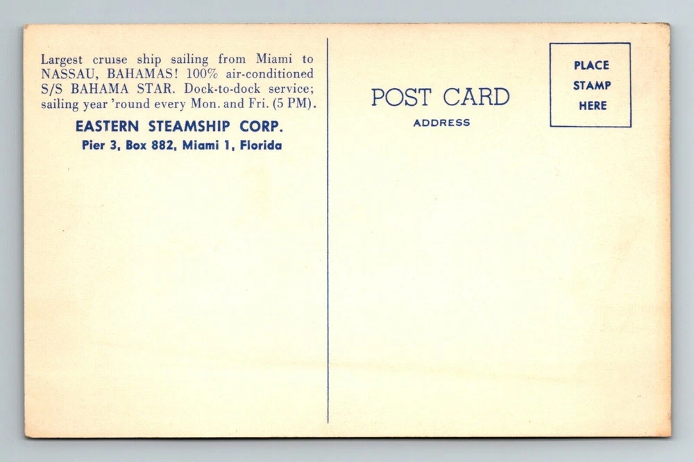 S/S Bahama Star Cruise Ship, Eastern Steamship Corp. Vintage Souvenir Postcard