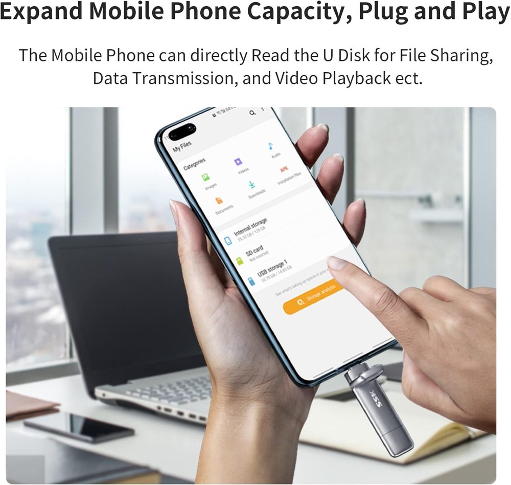 SSK 128GB USB C Drive Up to 550MB/s, Fast USB-Stick Dual Drive Type-c +A USB3.2 Description SSK External SSD Dual USB C + USB A: Equipped with an USB-C port and USB-A 3.2 port,the dual usb ssd flash drive allows you transfer data between smartphone/tablet and computer more conveniently. Instantly release space or quickly move pictures or movies on your OTG enabled Android Type C phone, tablet, MacBook, Windows computer, car audio system, smart TV and more. Ultra Fast High Speed: SSK usb 3.2 gen 2 portable ssd 128GB up to 550mb/s read speeds and 500mb/s write speed, which is 10 times faster than traditional USB 3.0 ssd hard drive. Let you move high-resolution photos, videos fast and large-capacity files. Based on internal testing, performance may vary slightly due to factors such as host equipment, interfaces, and usage conditions. lug and Play: Ultra external solid state drives supports plug and play, without any software installation. At the same time, USB ssd drive storage can expand the capacity of phones and computer. It is convenient for everyone to use the mobile phone to directly read the 128 GB ssd external for file sharing, data transmission, and video playback when working or studying. Work with most systems such as Windows / Android/ Macbook Pro and Mac OS. (incompatible with lightning port) Safe & Reliable: SSK solid state external hard drive is made of high-grade zinc alloy material, which is resistant to falling and abrasion. The design of the double-head protective cover better protects the two interfaces. External hard drive ssd have excellent shock resistance and fast heat dissipation performance to better protect your data.