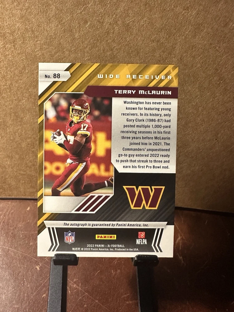 Elevate your football memorabilia collection with the SSP 2022 Panini XR Terry McLaurin Autograph Card, numbered 24 out of 25. This highly sought-after card features the Washington Commanders' star wide receiver, Terry McLaurin, and comes directly from the 2022 Panini XR set. Authenticated by Panini Authentic, the signature is a genuine mark of a sports enthusiast's dedication to the game and a testament to the new Washington receiving yards leaders game.
