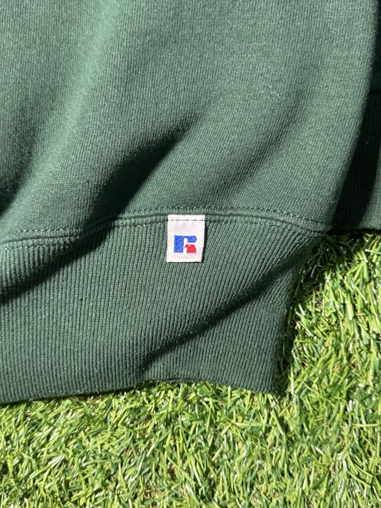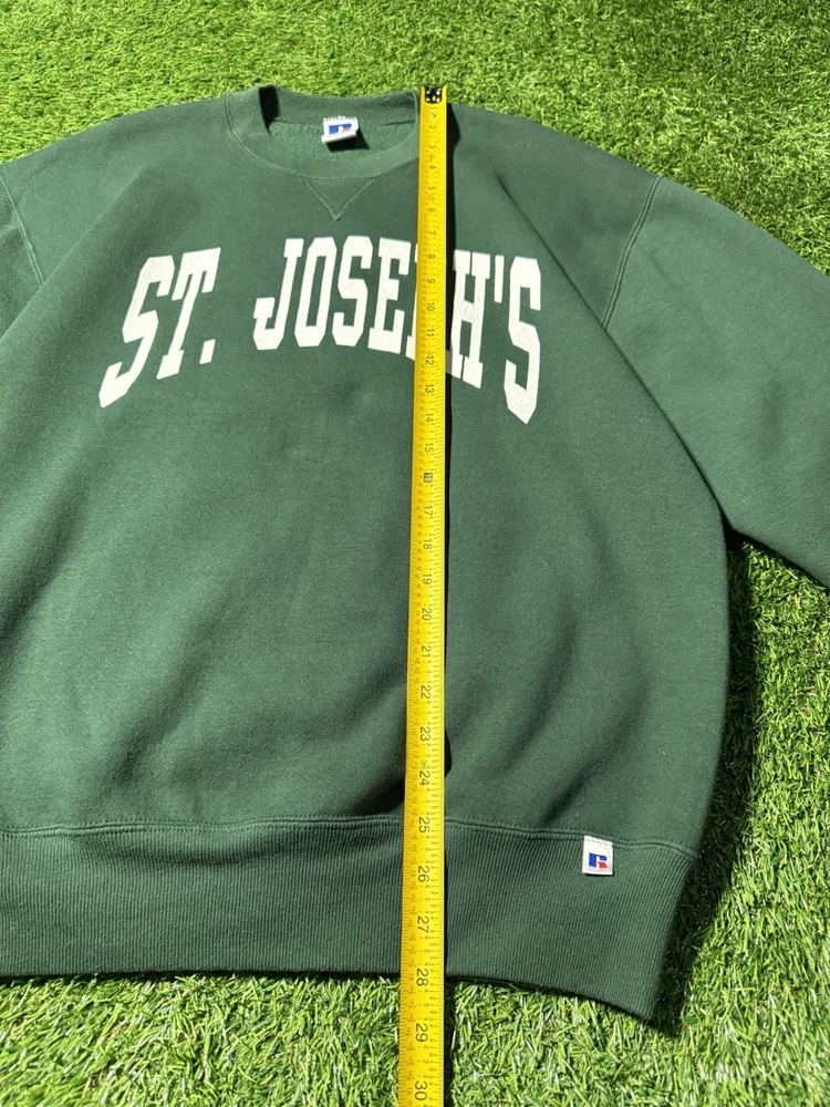 Rare Vintage Russell Athletic green crewneck sweatshirt featuring a graphic print logo, perfect for fans of ST John's University. Made of a blend of polyester and cotton, this pullover sweatshirt is cozy and comfortable to the touch, making it ideal for the winter, fall, and spring seasons. With a classic 90s USA style, this lightweight and breathable sweatshirt is machine washable and suitable for various activities such as tennis, cycling, golf, basketball, and more. Show off your school spirit with this retro piece that embodies the preppy and outdoor themes of the past.
