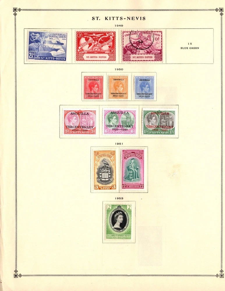 This Saint KItts and Nevis collection contains stamps issued from1949 to 1957 mounted on Scott International Album pages (Parts II & III). The Scott catalog value (2024) is $112.40.