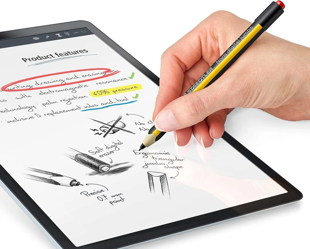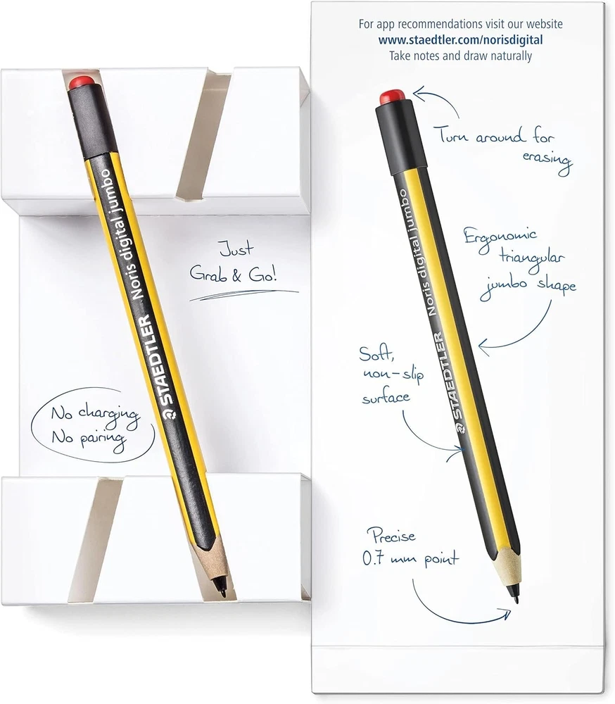 STAEDTLER Noris Digital Jumbo Stylus for EMR Technology Battery-Free Digital Pencil with Eraser The STAEDTLER Noris Digital Jumbo Stylus offers a highly natural writing and drawing experience, compatible with EMR-enabled devices (not compatible with Apple devices). This stylus has an ergonomic, triangular shape that feels like a traditional pencil, allowing comfortable use for both children and adults. It includes a soft digital eraser for convenient corrections on-screen, blending classic pencil design with advanced digital functionality. Battery-Free Convenience : This stylus does not require charging, pairing, or any driver installation, thanks to EMR technology by WACOM. Precise Control with 4,096 Pressure Levels : Adjustable line width based on pressure applied, making it ideal for art and detailed sketches. Palm Rejection : Enhanced EMR technology ensures only the tip of the pencil is recognized, so your hand can rest naturally on the screen without interfering. Soft Digital Eraser : Flip the stylus to erase just like a real pencil, offering seamless, natural corrections. Full Product Description Stylus in an ergonomic triangular jumbo pencil shape which provides a very natural writing and drawing experience on all compatible devices with EMR Technology No empty batteries or annoying cables : The stylus does not need a battery and so never needs to be charged; it does not need to be paired with your device or require a driver to be installed. IMPORTANT : Please check the compatible devices listed in the PDF "Application Guide" which you can find under the product guides and documents; Noris digital is not compatible with Apple devices. Palm Rejection : Thanks to the enhanced EMR technology, only the tip of the pencil is recognized, and the palm of your hand will be ignored. 4,096 pressure levels : The line width is adjustable depending on the pressure when writing/drawing. Noris digital jumbo is the enhanced version of our Noris digital classic, maintaining its analogue pencil design and supplemented with a soft digital eraser. Unique Feel The Noris digital has an ergonomic, triangular, and comfortable thick shape. The soft digital eraser allows you to delete text and drawings on the display and to correct errors simply by turning the stylus around. Digital Learning Thanks to its thicker shape, it is particularly suitable for children's hands and is ideal for their first writing and drawing exercises on digital devices. Kids will simply not want to put it down. Draw and paint Create quick notes Correct errors Operate devices Do your homework Write longer notes Edit presentations Highlight text At first glance, the STAEDTLER Noris digital looks just like a normal pencil and feels like one too - but it is actually a stylus for tablets, smartphones, and notebooks, designed for people who want a handwriting experience on digital devices. It is used on displays the same way a traditional pencil is used on paper. Compatibility A PDF sheet with information about compatibility can be downloaded under “Product guides and documents” / "Application Guide" or on the STAEDTLER homepage. Brilliant Technology The key component of the Noris digital is the innovative EMR lead from our partner WACOM. This technology enables the stylus to use an electromagnetic field generated by the device display (tablet, smartphone, or notebook) to interact with it inductively. Easy Writing This technology allows you to place your palm on the display to make writing more comfortable, just as you would on paper (function depends on the app). The ergonomic shape ensures you can write without your hand getting tired. You can highlight text and make notes in PDFs, such as on lecture notes, and share them without printing multiple pages, saving both paper and time. Feels Just Like a Pencil Like our pencils and colored pencils, the stylus is made of the wood-based material WOPEX. Thanks to the 4,096 pressure levels, you can intuitively vary the line width, just like with a pencil. Simply press harder or more softly with the stylus (function depends on the app). Even the precise 0.7 mm writing point was modeled on a classic pencil. Independent - No Empty Batteries or Annoying Cables Thanks to its advanced technology, the stylus does not need a battery and so never needs to be charged. Additionally, it does not need to be paired with your device or require a driver to be installed. Comfortable Use The Noris digital can be used anytime, anywhere—at home, school, in the office, or on the road. Simply unpack and get started. Familiar Handling The writing angle of the Noris digital is flexible (between 40 and 140º), giving a familiar feel, allowing you to use your device naturally, and providing full control over your inputs. Effective Presentation Anyone can pick up the Noris digital and use it intuitively. Use it to make your presentations more creative and effective—even live in meetings. Specifications Technology : EMR by WACOM (electromagnetic resonance) Design : Thick, triangular, ergonomic shape suitable for children and adults Material : WOPEX wood-based material Pressure Levels : 4,096 for variable line width Point : Precise, replaceable 0.7 mm tip Dimensions : Approximately 140 x 9.1 mm Weight : Approx. 10 g Includes : Stylus, five spare nibs, and a replacement tool Important : Ensure your device is compatible with EMR technology. Noris digital is not compatible with Apple or Pixelbook devices. Compatibility Guide PDF FAQs What does EMR stand for? Electromagnetic Resonance (WACOM technology) enables the stylus to use an electromagnetic field from the device display, allowing for precise detection without battery usage. What devices are compatible? Devices must have EMR technology in the display. Please refer to our compatibility list to ensure device support. Note that model numbers may vary by country. Is this stylus compatible with Apple devices? No. Apple devices use a different technology. Do I need to 