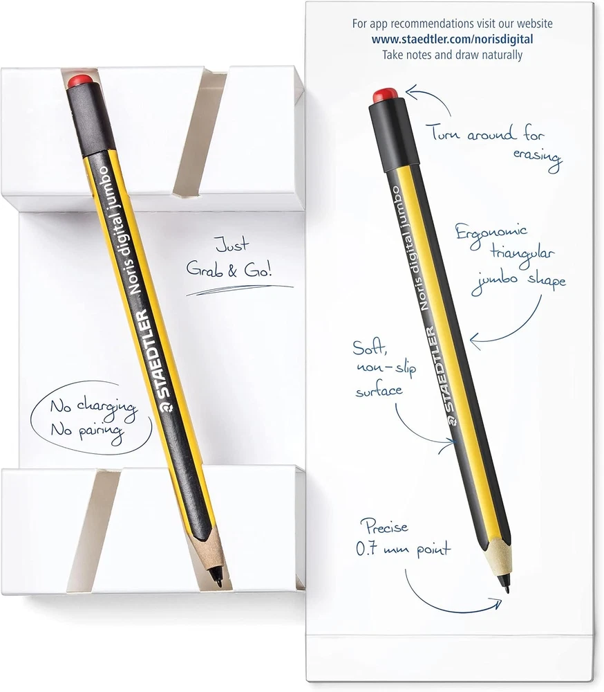 STAEDTLER Noris jumbo 180J 22. EMR Stylus with soft eraser. For yellow-black Product Details Brand: STAEDTLER Series: Staedtler Noris digital jumbo 180J 22 Item model number: STAEDTLER Noris Digital Jumbo 180J Item Weight: 0.353 ounces Product Dimensions: 5.51 x 0.36 x 0.36 inches Item Dimensions LxWxH: 5.51 x 0.36 x 0.36 inches Color: yellow-black Battery Type: Alkaline Manufacturer: STAEDTLER Language: English, English, English, English, English Color: yellow-black Brand: STAEDTLER Material: Wood Item Weight: 10 Grams Battery Average Life Standby: 50 Hours Compatible Devices: Please check the compatible devices listed in the "Compatibility Guide (PDF)" Item dimensions L x W x H: 5.51 x 0.36 x 0.36 inches Are Batteries Included: No Batteries Required?: No Battery Description: Alkaline Stylus in an ergonomic triangular jumbo pencil shape which provides a very natural writing and drawing experience on all compatible devices with EMR Technology No empty batteries or annoying cables: The stylus does not need a battery and so never needs to be charged; it does not need to be paired with your device or require a driver to be installed IMPORTANT: Please check the compatible devices listed in the PDF "Application Guide" which you can find under the product guides and documents; Noris digital is not compatible with Apple devices Palm Rejection: Thanks to the enhanced EMR technology just the tip of the pencil is recognized and the palm of your hand will be ignored 4,096 pressure levels: The line width is adjustable depending on the pressure when writing/drawing STAEDTLER Noris digital jumbo 180J 22 - Stylus for digital writing, drawing and erasing on EMR equipped displays The Noris digital jumbo allows you to write, draw and erase straight onto your touchscreen tablets, smartphones and notebooks if they are equipped with EMR technology. The stylus combines the look and feel of a traditional pencil with the technology of WACOM, offering you the advantages of both. The Noris digital is compatible with a variety of smartphones, tablets and notebooks with EMR technology. Please refer to the PDF "Application Guide (PDF)" which you can find under "Product guides and documents". Product features: EMR technology of WACOM (electromagnetic resonance) Comfortable thick triangular shape which is particularly suitable for children's hands and is also comfortable for adults, and allows you to write without your hand getting tired Non-slip soft surface 4,096 pressure levels Palm Rejection Adjustable line width depending on the pressure when writing/drawing Precise, replaceable 0.7 mm pencil point No batteries needed No pairing or driver installation Dimensions: Approximately 140 x 9.1 mm Weight: Approximately 10 g WOPEX wood-based material Made In Germany Scope of delivery: One STAEDTLER Noris digital jumbo Stylus with a soft digital eraser, five spare nibs and a replacement tool; Noris digital is not compatible with Apple devices; Note:-It is important to check if the end device has an EMR digitizer in the display before purchasing to make sure the Noris digital will work on the end device. Compatibility list: