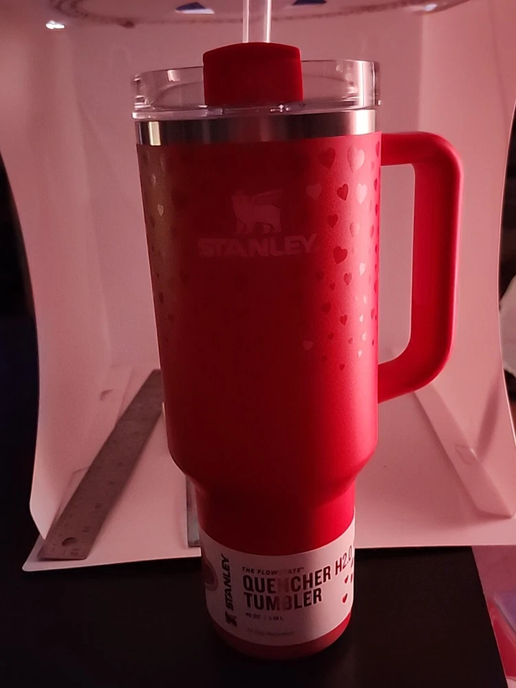 TARGET LIMITED EDITION Valentine's Day with the Stanley 40oz H2.0 Flowstate Quencher Tumbler in a beautiful Ruby Hearts pattern. RED TUMBLER HARD TO FIND 40 OZ This tumbler is perfect for enjoying your favorite hot or cold beverages on the go. Made with high-quality stainless steel, plastic, and BPA-Free Plastic, this tumbler is break and chip-resistant, freezer safe, and suitable for hot beverages. The tumbler comes with a drink-through lid, a straw, and a handle for easy sipping and carrying.