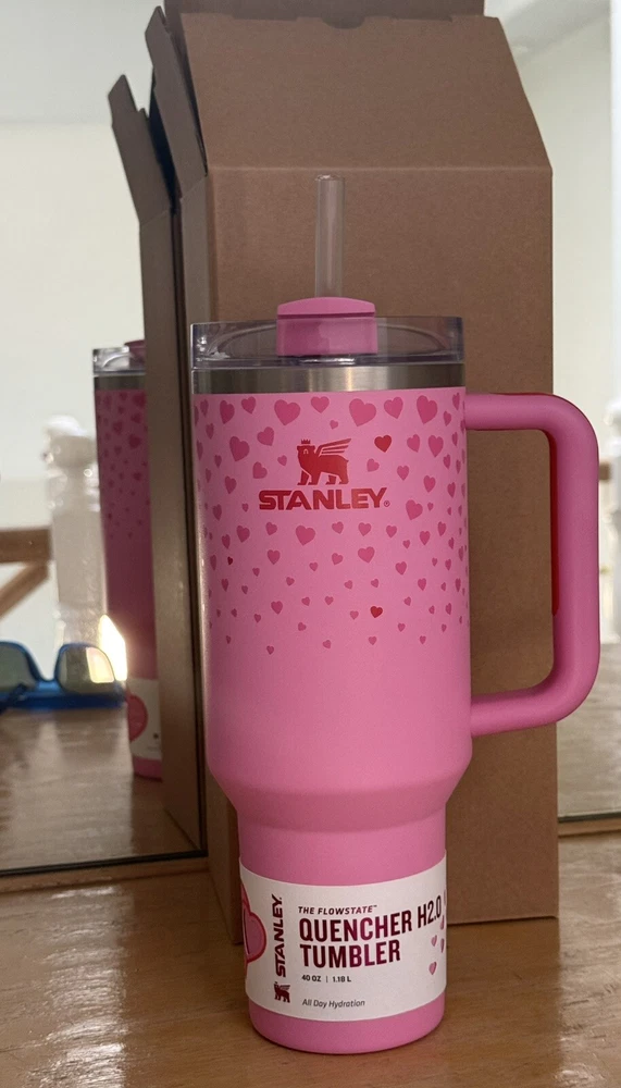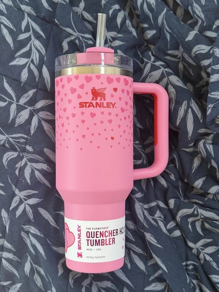 The Stanley Valentine's Day tumbler features a pink design with hearts, perfect for celebrating Valentine's Day in 2025. This 40oz stainless steel tumbler is suitable for both hot and cold beverages and comes with a lid and straw for convenience. The tumbler is insulated to keep drinks at the desired temperature and includes a personalized touch with a colorway of sweet hearts and ruby hearts. This authentic Stanley tumbler is a festive addition to your drinkware collection.