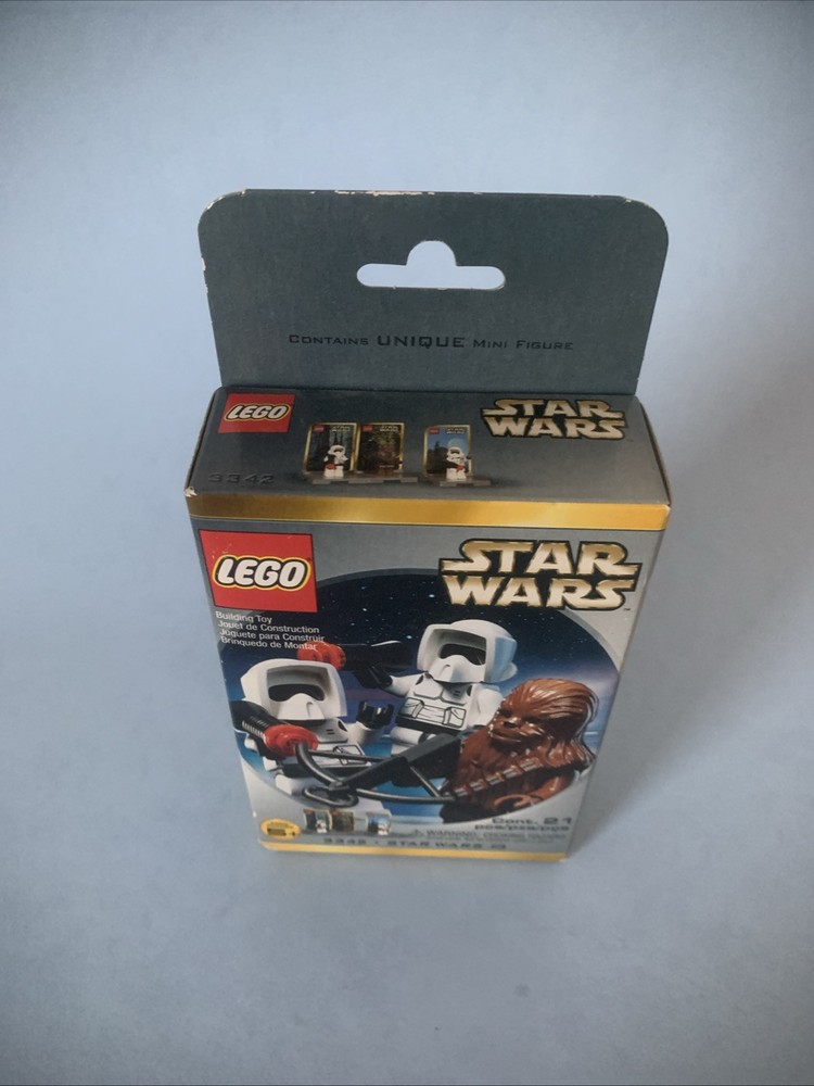 This is a rare, retired LEGO set number 3342 from the Star Wars theme released in 2000. It features Chewbacca and 2 Biker Scouts. The set contains 21 pieces and comes in a box packaging. It is designed for ages 2 and up, was made in Denmark, and is no longer in production.