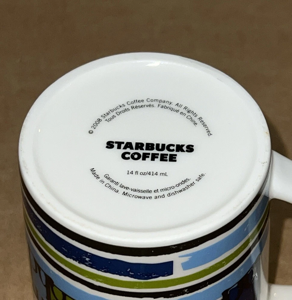 This Starbucks coffee mug from 2008 features a colorful scooter design and the phrase "My journey begins today" on the front. The 14 oz mug has a blue interior and is a great addition to any coffee or tea lover's collection. The mug is an original piece of Starbucks advertising and is perfect for fans of the brand. Cc1