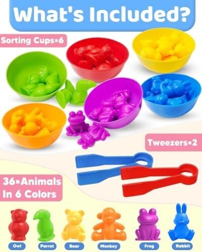 Free eBay listing template designed by dewiso.com Counting Animals Montessori Toys for 3 4 5 Years Old Boys Girls, Preschool Learning Activities Kindergarten Educational Sensory Toys Gifts for Kids Toddlers Ages 2-4, 3-5, 4-8 FREE AND FAST SHIPPING! COUNTING ANIMAL TOYS: This preschool learning toy includes 36 multi-colored animals (monkey,frog,bear,bunny,parrot and owls), 6 rainbow color sorting bowls and 2 tweezers. The montessri toys are suitable for toddlers and kids aged 2-4, 3-5, 4-8 years old and help them learn early math. DEVELOP MATH SKILLS: The counting toys are ideal learning materials for learning animal type sorting and grouping, number counting and color matching make kids interested and confident in learning math. Nice teaching tool and helpful learning resource for teachers, parents to use at home, kindergarten and classroom. LEARNING THROUGH PLAY: While sorting the preschool toys, children need to sit and balance core muscles to move hands or use tweezers freely and figure out which color fits which bowl. This kind of activity can attract your kid's attention and interest, which can keep your kids engaged for hours. IDEAL GIFTS FOR TODDLERS : Are you still hesitated to choose birthday or Christmas gifts, stocking stuffers for 3 4 5 year old boys and girls? This montessori toys for toddlers 2-4, 3-5 years is definitely the amazing choice that you won't regret! SAFE AND WELL-MADE: Made with high quality, non-toxic and washable materail, this learning toys can last for years. The storage bucket provided is easy to collect store and carry after playing. Product We offer a 30-Day Return Policy on items which you are not completely satisfied with. You have the option for a full-refund or an exchange of the item. No returns are available on items shipped outside of the US . Shipping We offer Free Shipping to the US and ship within 2 business days of payment, usually sooner. We use UPS express shipping. That's why your products are usually delivered within 3 days . Contact We try our very best to make sure every customer is completely satisfied. If there's a problem , message us! We're happy to help. 24/7 live chat available.