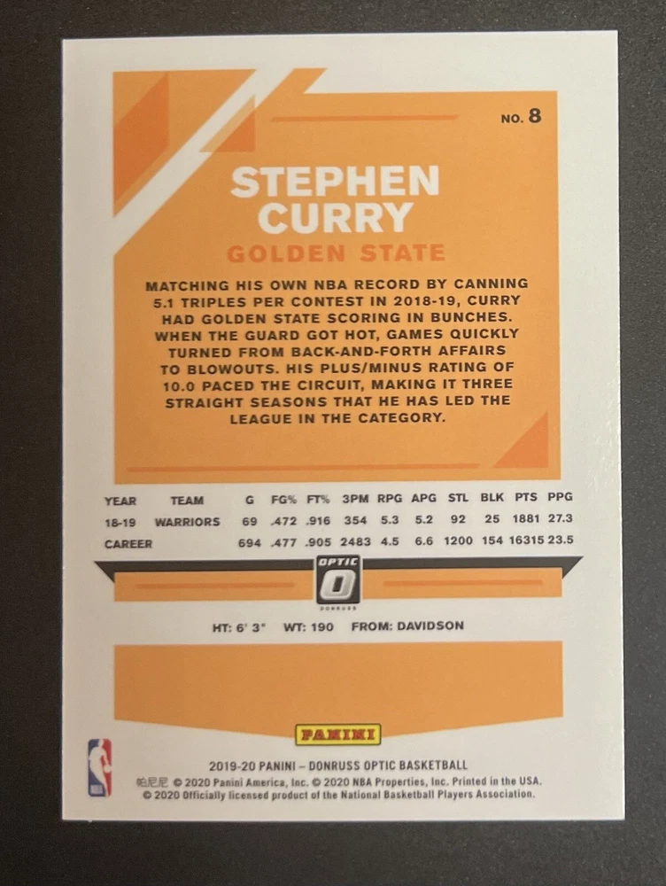 Sport: Basketball Player: Stephen Curry Card Number: #8 Year: 2019 Country/Region of Manufacture: Jordan Player/Athlete: Stephen Curry League: NBA Card Attributes: Short Print (SP), Single-Parallel, Rookie, Refractor Type: Sports Trading Card Team: Golden State Warriors Season: 2019-20 Series: Optic Basketball Parallel/Variety: Optic Product: Set Card Manufacturer: Panini
