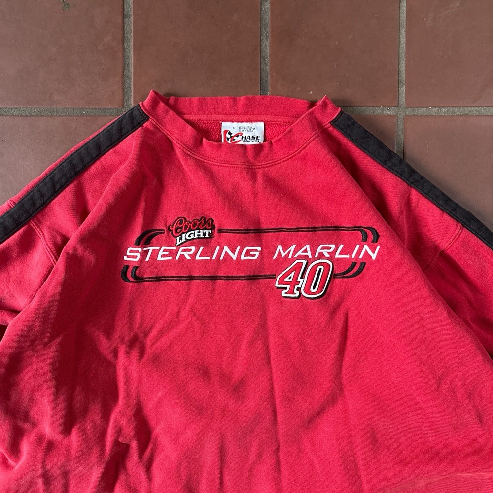 The Sterling Marlin #40 Coors Light Chase Authentics Sweatshirt in size Large is an officially licensed NASCAR fan apparel featuring the iconic driver's name and number. The red sweatshirt is perfect for any auto racing fan looking to show their support for Sterling Marlin while staying warm and comfortable. Whether for a race day or just lounging around, this sweatshirt is a must-have for any NASCAR enthusiast.