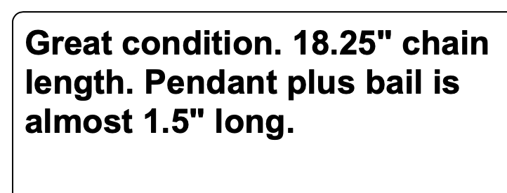 Great condition. 18.25" chain length. Pendant plus bail is almost 1.5" long. We are so thankful for our customers! However, we have thousands of listings, and therefore receive hundreds of messages, every single day. So, if you are asking about a price drop, or a shipping price drop, or asking for extra measurements, or to add additional photos, please allow me to answer you here, No thanks. If your question is not one of those questions, we will be happy to answer you individually. YES...WE DO COMBINE DOMESTIC SHIPPING. Extra jewelry items ship for $2 each (except for large jewelry lots). We will refund the difference as we are mailing out.....we hope you enjoy shopping with us! We encourage you to read the description and check all photos.