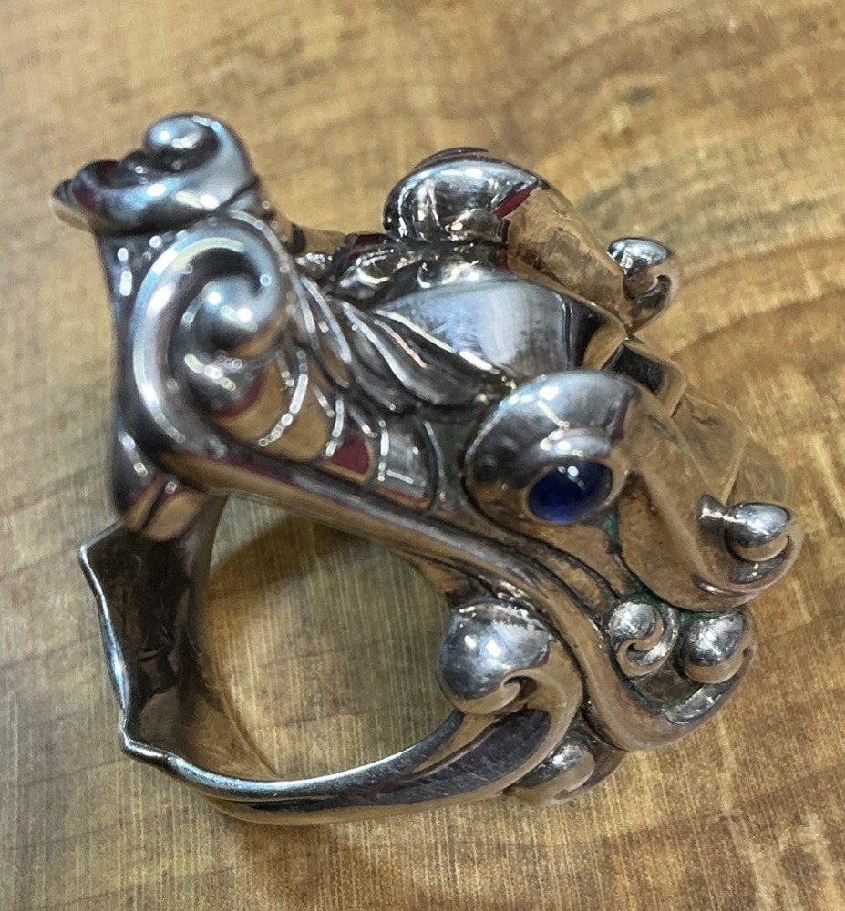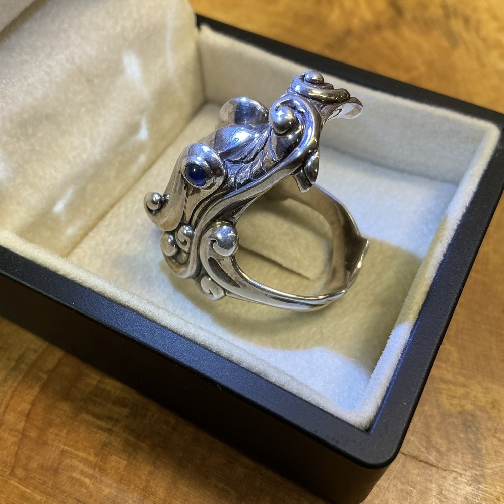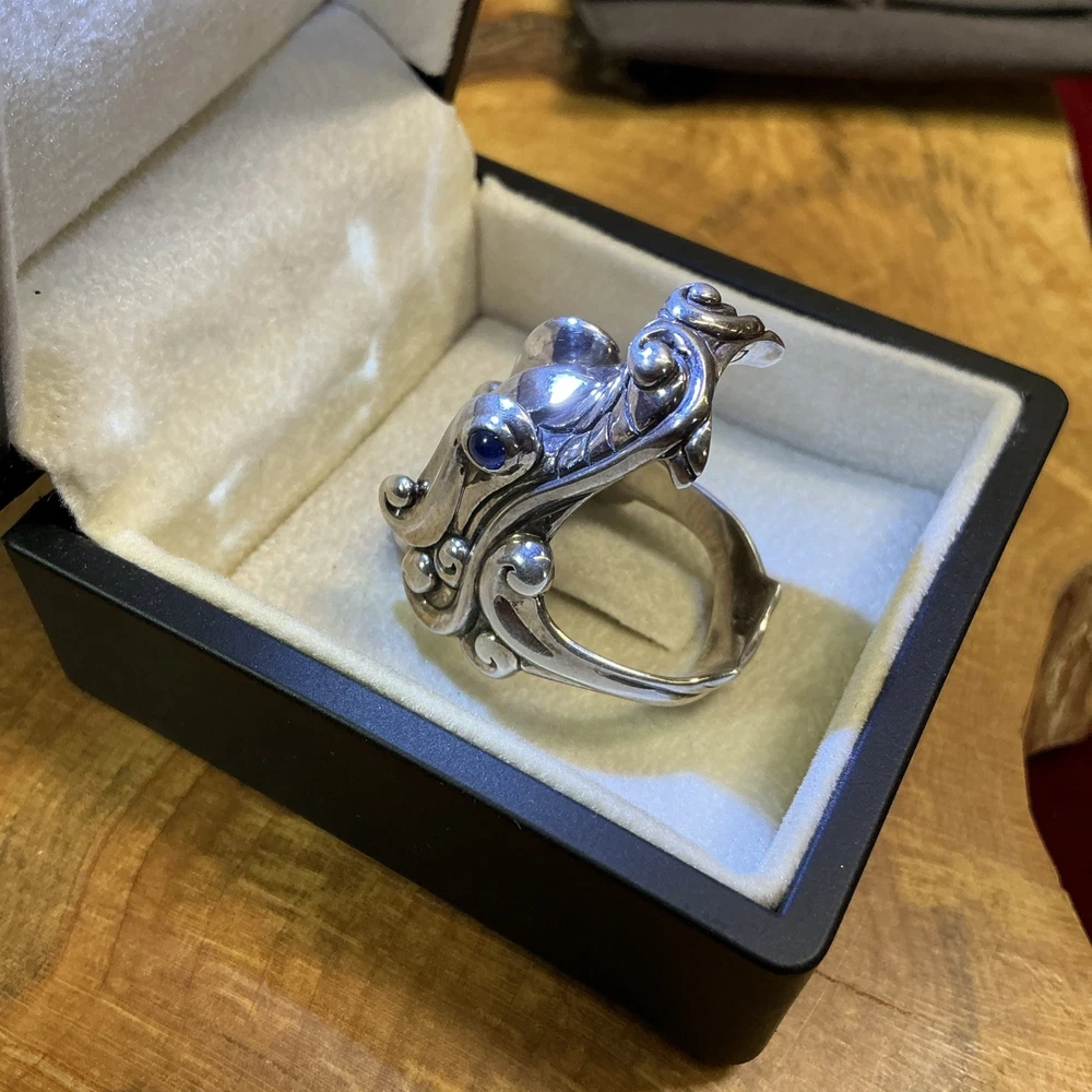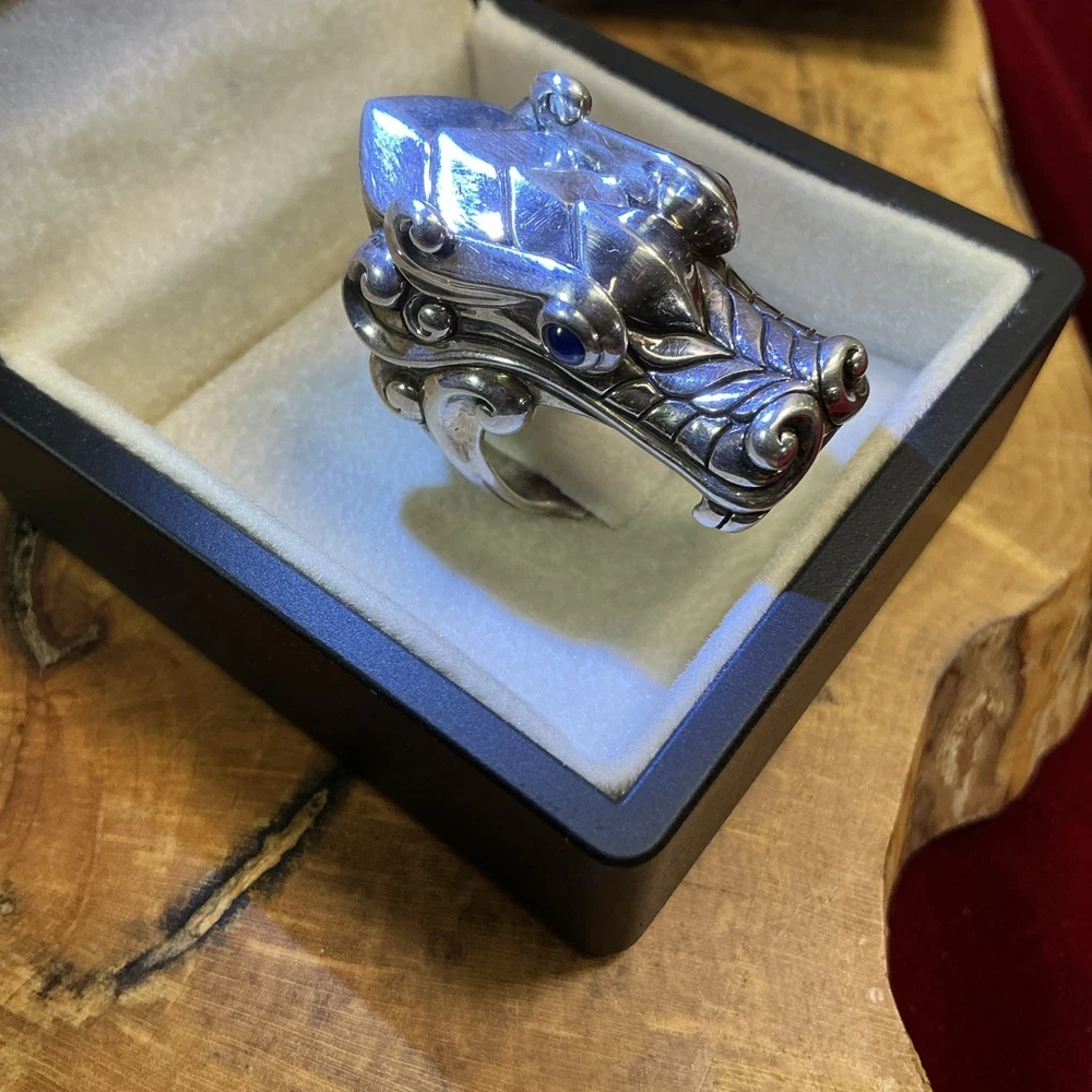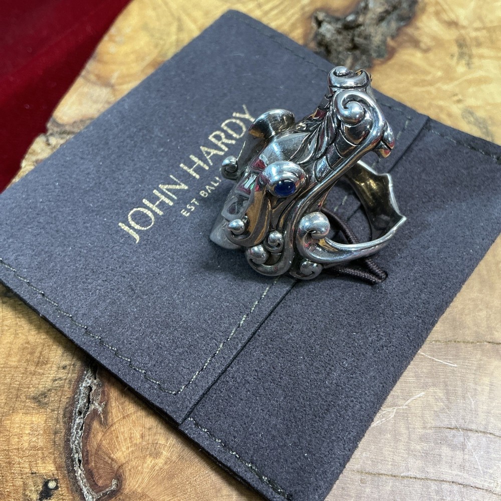 The STERLING SILVER John Hardy Legends Naga Dragon Blue Sapphire Eyes Ring in size 10 is a handmade signet ring featuring a unique dragon head design with blue sapphire eyes. Crafted from sterling silver with a purity of 925, this modern piece is part of the Naga Legends collection by John Hardy. Sizable and originating from Indonesia, this round ring is perfect for any occasion and showcases the brand's signature style and craftsmanship. Listening includes original John Hardy pouch as pictured.
