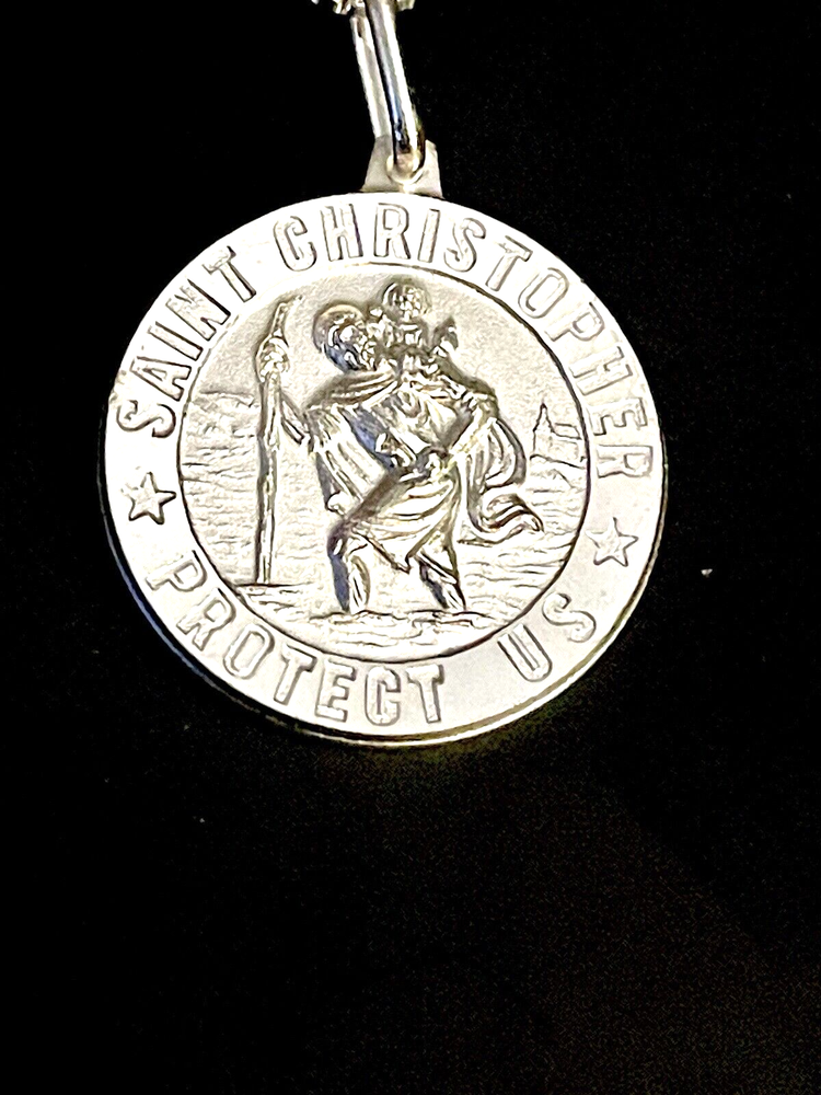 WELCOME! Up for immediate purchase we have a NEW Solid Sterling silver Charm Medal ST. CHRISTOPHER Necklace on a 24" solid sterling silver 1mm thick mirrored box pendant chain, with a spring ring clasp. High Polish Mirror finish, Large 21mm round, or about .8' inch. THIS IS A SOLID S terling Silver medal and chain. NOT Plated and NOT Filled. This medal measures 21mm in diameter, not including the bail (the bail is about 4mm). The set weighs approx. 8.6 grams of sterling silver. FAST, FREE, US SHIPPING IN A DRAWSTRING GIFT BAG. Bid with confidence. We have been in the jewelry business since 1988. We have two eBay sites, as chicpromotions, and chicpromotions2, with 100% positive feedbacks, and over 35,600 feedbacks. Visit our eBay stores! chicpromotions2 ( Feedback Score Of 10,600 ) chicpromotions ( Feedback Score Of 26428 )