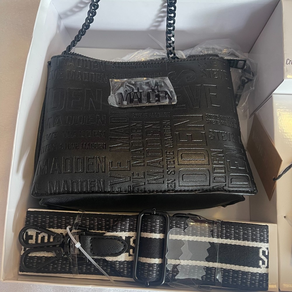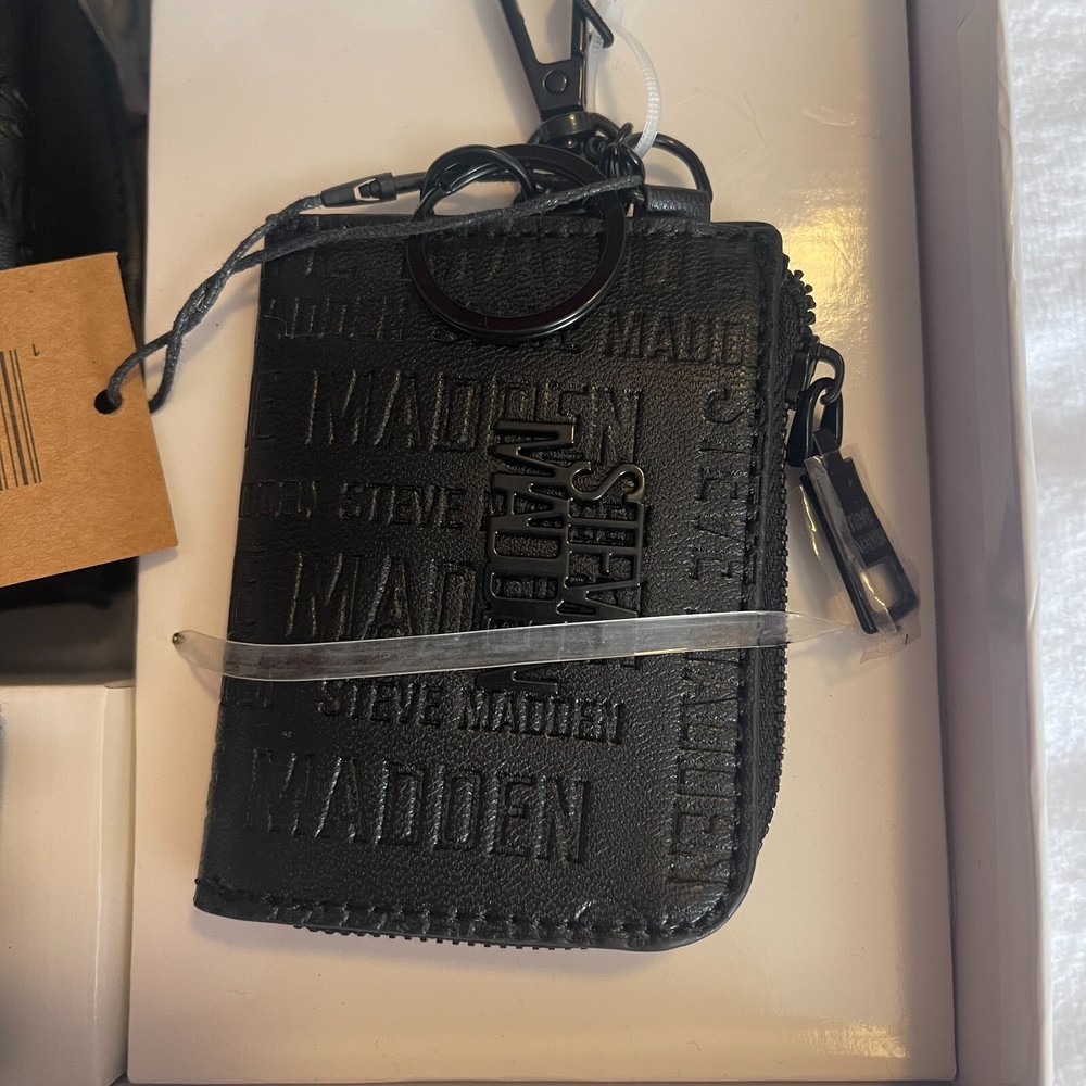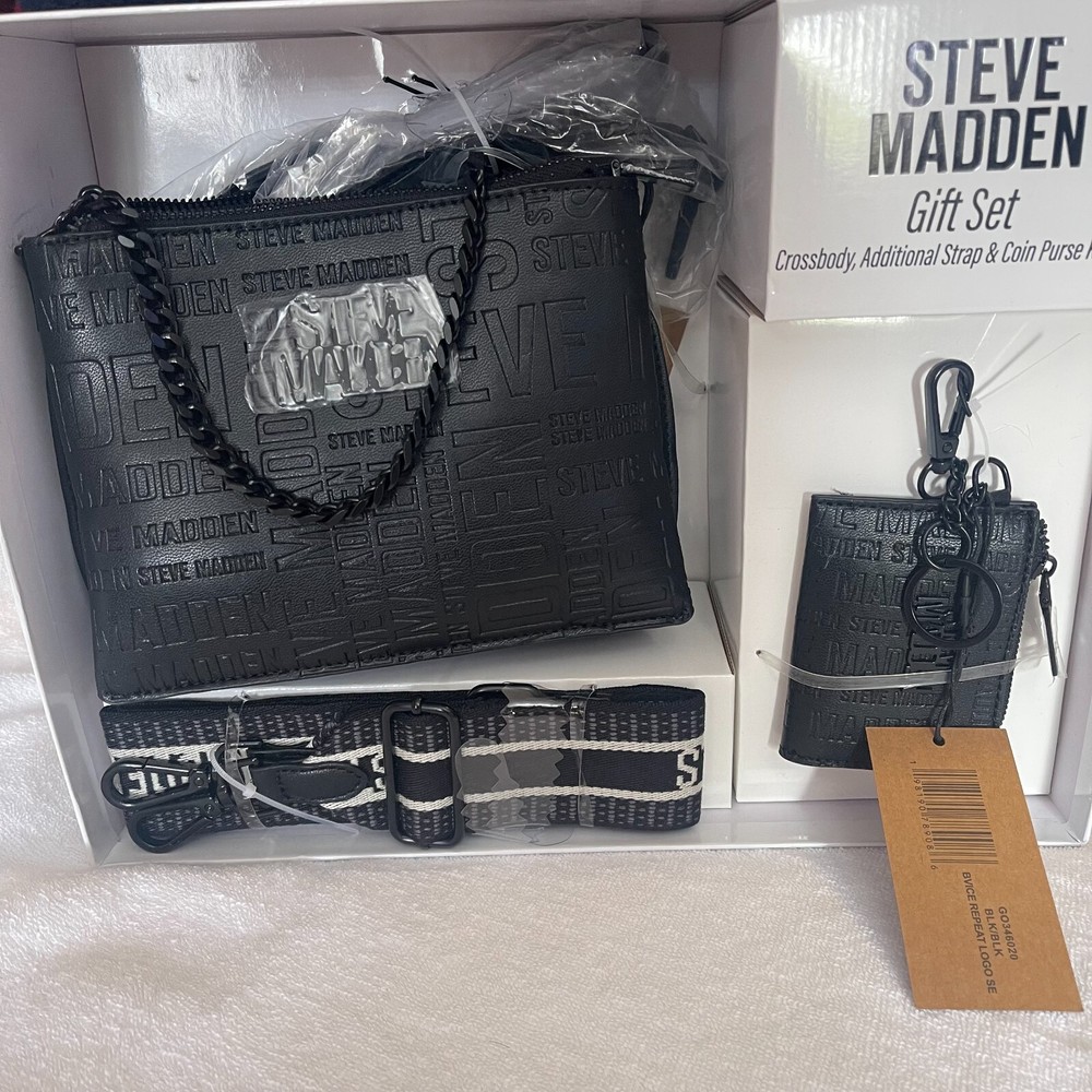 This Steve Madden gift set includes a black crossbody bag with additional straps and a coin purse. The bag is made of faux leather and features a medium size. It is perfect for women who love to stay stylish on the go. The brand's product line is known for its quality and this bag is no exception. The exterior color is black, which makes it easy to pair with any outfit. The bag also comes with a coin purse, making it convenient for carrying small change. Buy this stylish crossbody bag and coin purse set from Steve Madden today!
