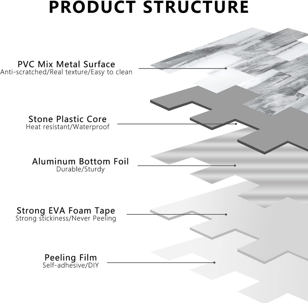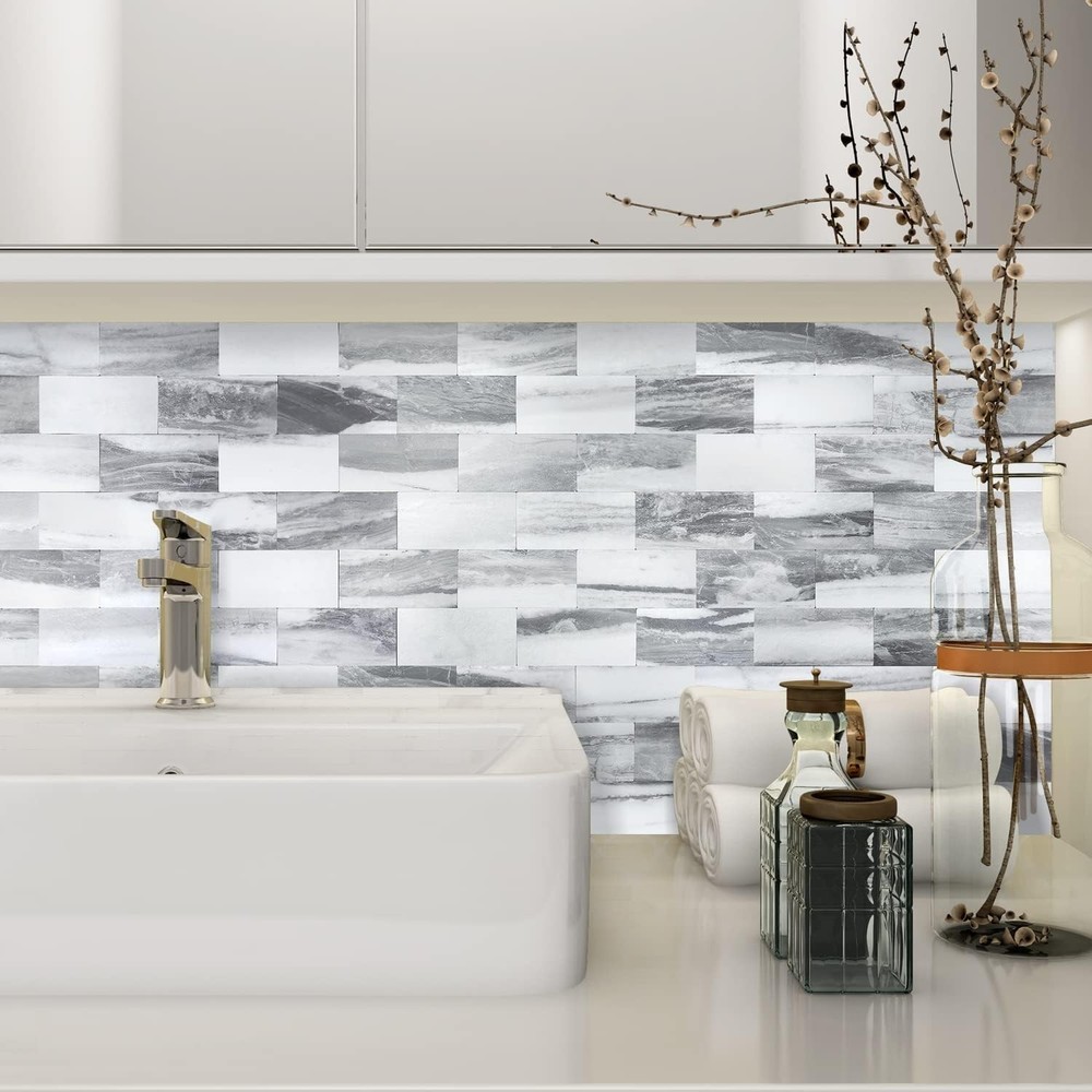 The STICKGOO 10-Sheets Peel and Stick Backsplash is a convenient and stylish home improvement solution. These PVC wall tiles feature a classic gray color with a laminate finish, perfect for adding a touch of elegance to any wall. The peel-and-stick installation makes it easy to apply and remove, ideal for DIY projects or quick updates in your home. Perfect for creating a modern and sleek backslash in your kitchen or bathroom.