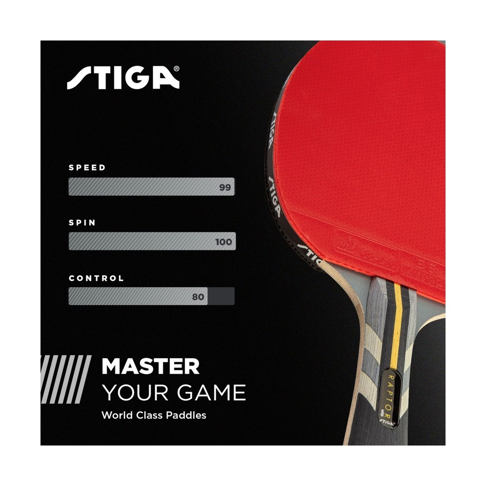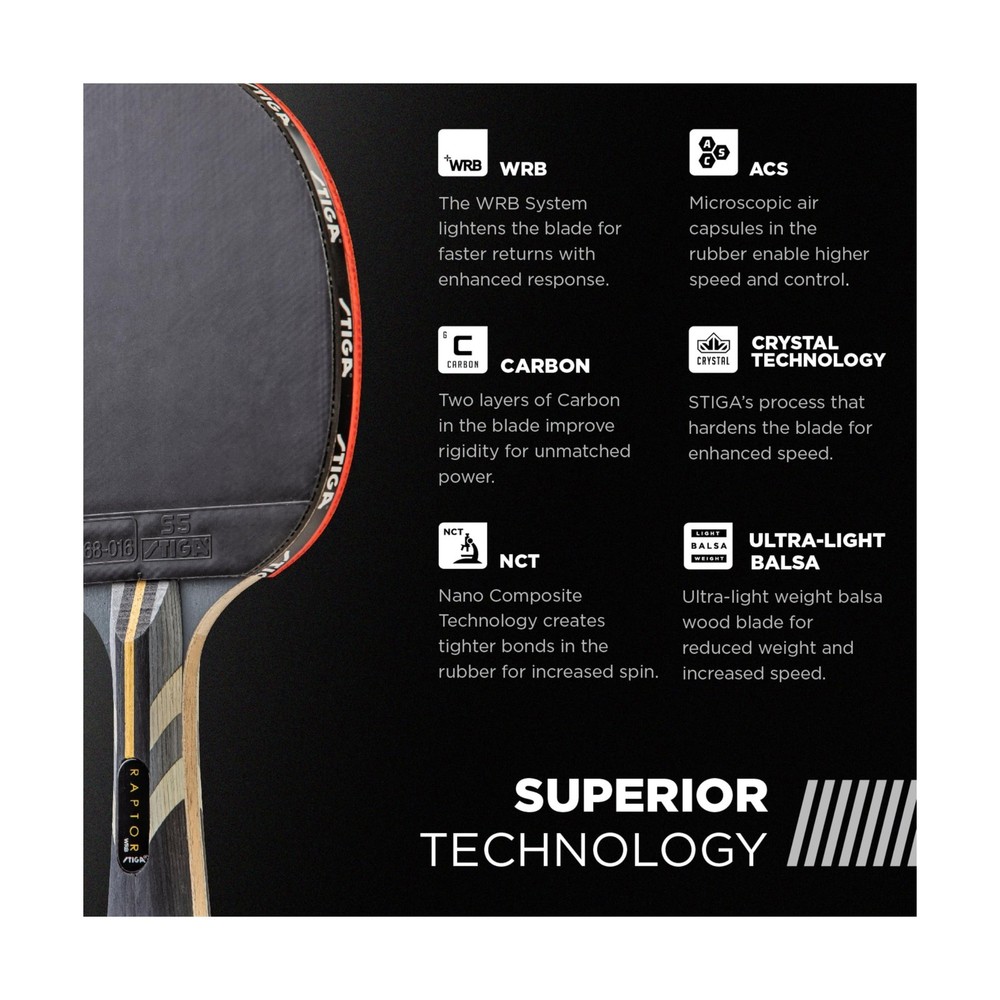 STIGA Carbon Fiber Ping Pong Paddle - 2mm Sponge, Flared Handle - Performance Table Tennis Racket, Black Description The STIGA Raptor table tennis racket expertly unites cutting-edge technologies with perfected materials. Used by top players around the world, the Raptor puts extreme power and spin into the palm of your hand. Built for competition, the Raptor seamlessly fuses STIGA's Nano Composite Technology—which forms stronger and tighter bonds in the rubber—with ACS Technology—which combines microscopic air capsules in an ultra-light rubber—delivering high speed with maximum elasticity and outstanding control. STIGA's Crystal Technology hardens the blade for increased speed and its WRB Technology increases blade balance, recovery rate, and ball sensitivity. The Raptor boasts an integrated carbon fiber blade and performance ratings of Speed: 99, Spin: 100, and Control: 80. Features: STIGA Since 1944, STIGA has been the innovative leader in table tennis equipment. STIGA combines superior craftsmanship with exceptional performance in every product. The highest quality equipment for all, from amateur to pro. Thats the STIGA heritage BUILT FOR COMPETITION Nano Composite and ACS Technologies form stronger and tighter bonds in the ITTF approved smooth inverted S5 rubber for high speed and spin with maximum elasticity and outstanding controlthe perfect racket for tournament play SUPERIOR TECHNOLOGY This racket unites STIGA's Crystal and WRB Technologies for a hardened, light blade with faster returns, more power, and extra sensitivity of touch PRECISION BLADE The 7-ply blade boasts 5 layers of light-weight balsa wood and 2 layers of high-performance, integrated carbon carbon fiber that combine with a 2mm sponge for a larger sweet spot and cleaner hits PERFORMANCE RATINGS Speed: 99, Spin: 100, Control: 80 Product Details: Brand: Stiga Material: Rubber Sport: Table Tennis Item Weight: 0.49 Pounds Frame Material: Carbon, Carbon Fiber Age Range (Description): Adult UPC Global Trade Identification Number: 81 Brand: Stiga Material: Rubber Sport: Table Tennis Item Weight: 0.49 Pounds Frame Material: Carbon, Carbon Fiber Age Range (Description): Adult UPC: 754806261881 Global Trade Identification Number: 81 Item Package Dimensions L x W x H: 10.71 x 6.42 x 1.26 inches Package Weight: 0.23 Kilograms Item Dimensions LxWxH: 11 x 6.5 x 0.1 inches Brand Name: Stiga Warranty Description: 90 Day Limited Model Name: Raptor Manufacturer: STIGA Part Number: T1291 Style: Ping Pong Paddle Included Components: Table Tennis Racket Skill Level: All Hand Orientation: Ambidextrous Grip Size: Standard Date First Available: June 12, 2019 Delivery We Do Not Ship Outside of the Continental US. Return Policy All items qualify for returns within 30 days of receipt. Buyer is responsible for return shipping on any item that is not damaged. Feedback We take our reputation seriously, we buy and sell online, so we understand the value of trust. If you are unsatisfied with your order, please contact us and we will work with you to resolve it to your satisfaction.
