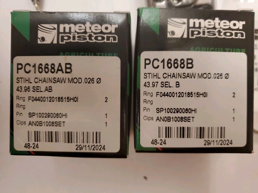 PLEASE CHECK OUT OUR OTHER EBAY STORE FOR MORE ITEMS: https://www.ebay.com/usr/chainsawredeemer85 You can also find me on YouTube with many useful videos how to work on your own equipment: @chainsawredeemer85 / incidental auditor PLEASE ENSURE FITMENT PRIOR TO PURCHASE. WE TRY OUR VERY BEST TO GIVE A DETAILED LIST OF MODELS OUR PARTS FIT. BUT SOMETIMES THERE MAY BE MORE MODELS, AND WE ARE ONLY HUMAN. SOMETIMES MISTAKES HAPPEN, WHICH IS WHY WE ALLOW RETURNS! PLEASE ASK ANY QUESTIONS YOU MAY HAVE AND IF YOU CANNOT FIND THE ITEM YOU ARE LOOKING FOR, PLEASE ASK AS WE MAY HAVE IT BUT NOT YET GOTTEN AROUND TO LISTING IT!!! SHIPPING: ENJOY COMBINED SHIPPING ON MULTIPLE ITEM ORDERS! ALL ITEMS WILL BE SHIPPED SAME OR NEXT DAY VIA USPS OR UPS DEPENDING ON SIZE. SHIPPING IS BASED ON EBAY INTERNATIONAL SHIPPING PROGRAM AND THUS ALL SHIPPING OPTIONS WILL SHOW ON THE LISTING. ALSO, WE LIKE TO CONSERVE MATERIALS AND REPURPOSE TO CUT DOWN ON WORLDWIDE WASTE. THIS MEANS SOMETIMES YOUR PACKAGE WILL BE USED MATERIAL----IF YOU WANT ALL BRAND-NEW BOX AND PACKING MATERIALS SIMPLY ASK AND YOU SHALL RECEIVE AT ABSOLUTELY NO EXTRA CHARGE This listing is for 1 METEOR PISTON KIT WITH CABER RINGS, WRIST PIN AND C- CLIPS 44MM for STIHL 026 44mm CHAINSAW. NOTE: I have selections A and AB. AB weighs 52.63oz and B is 53.66oz. This is the only difference found. You may request at checkout add a note which selection. Otherwise you will get whichever is available.