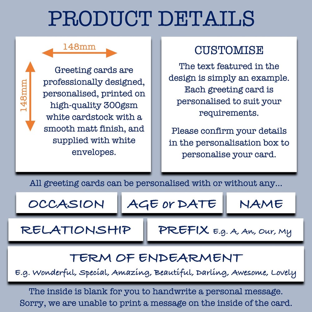 PRODUCT DETAILS: This greeting card measures 148mm x 148mm. It is printed on high-quality white 300gsm cardstock with a smooth matt finish and supplied with a white envelope. Due to varying screen resolutions, the colours you see on your screen may differ slightly from those in the finished product. PERSONALISATION: This greeting card can be personalised for any occasion, age, date, relationship and name. Please confirm your details in the personalisation box and double-check that they are correct before submitting. If required, specific details (e.g., name) can be omitted. If no details are added, it will simply read as shown in the listing, without personalisation. The inside is blank for you to handwrite a personal message. Sorry, we are unable to print or handwrite a message on the inside of the card. DELIVERY POLICY: All orders placed Monday to Friday before midday (excluding bank holidays) are dispatched the same day via Royal Mail directly to the buyer, with proof of postage. * FREE DELIVERY is sent second-class and does not include a guaranteed delivery date. The estimated delivery date provided by eBay is a guideline only and does not guarantee delivery by the date shown. Please note that Royal Mail now delivers second-class mail only on alternate weekdays and is experiencing significant delays. In many cases, items arrive several days after the estimated delivery date; this should be taken into account before placing an order. To avoid disappointment, please do not rely on eBay's estimated delivery dates, as they are unreliable, and we cannot change them or control delivery once the order has been shipped. Free delivery is offered as standard. By not selecting a tracked delivery service, you acknowledge that your order may arrive after the estimated delivery date and agree to accept the associated risks. We cannot accept responsibility for any delays outside of our control caused by Royal Mail. The tracking number provided for second-class deliveries is a proof-of-shipping number and will not be recognised by the Royal Mail online tracking service. * GUARANTEED TRACKED next-day before 13:00, 24-hour and 48-hour delivery options are available at checkout. If you need your item by a specific date, please select a tracked delivery service. A tracked service provides peace of mind by guaranteeing your item arrives on the specified date before the occasion. RETURNS AND REFUNDS POLICY: Upon receipt of payment, all items are custom-made to order. Therefore, we are unable to accept requests to cancel, change, or return items, except in cases of our error. We hold ourselves to a high standard and strive to meet buyer expectations. If, for any reason, you are not satisfied with your order due to our error, please message us within 24 hours of receipt with a photo clearly showing the defect, and we will provide a replacement. Items lost in transit are non-refundable, but replacements will be dispatched 5 business days after the estimated delivery date. CUSTOMER SERVICE: If you have any questions or are looking for a design with a particular character or theme that isn't listed, please don't hesitate to contact me. Our friendly and reliable design team will be happy to work with you to create something special just for you! We reply to messages via our administration office, which is open Monday-Friday (excluding bank holidays) from 10:00 to 14:00.