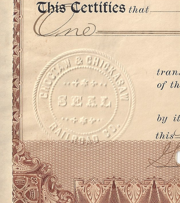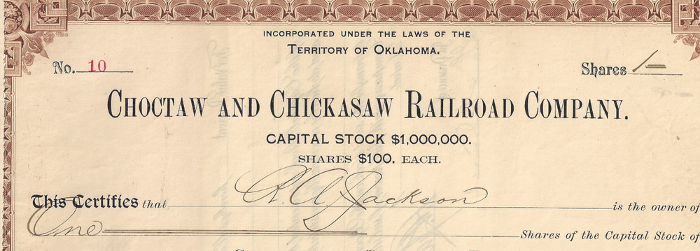 Choctaw & Chickasaw Railroad Company Inc. Territory of Oklahoma Ran 28 miles Controlled by Chicago, Rock Island & Chicago RR Capital Stock Certificate for 1 share, #10 , Dated 1904 In EARTH color Stub attached Read information image. ** NOTEWORTHY ** PRINTER: Weatern Bank Note Co, Chicago Information image copies are included with certificate Images: POSTAGE U.S. Sent First Class with tracking, starting @ $6.00 US Canada Sent First Class Canada with no tracking, starting @ $6.00 US NON U.S, case by case, starting @ $8.00 US, sent First Class. I do ship world wide. -- All the certificates and all other items I sell are sold as collectibles only; although they are authentic, they no longer hold financial value. I do have other items up for auction. I Do Combine