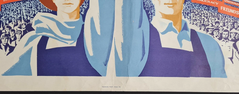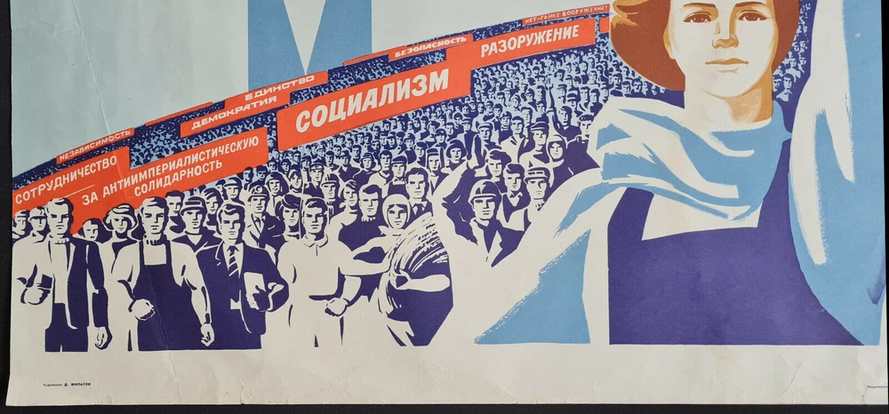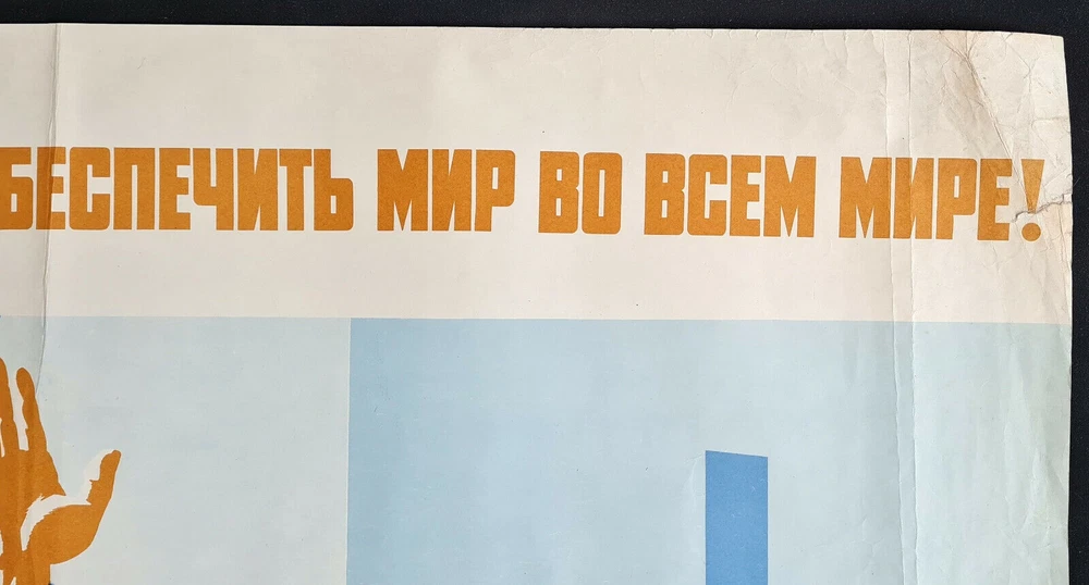Original slogan on the poster says: ОСТАНОВИТЬ ГОНКУ ВООРУЖЕНИЙ, ОБЕСПЕЧИТЬ МИР ВО ВСЕМ МИРЕ! Literally English translation: STOP WEAPON RACE, MAKE PEACE WORLDWIDE! Big background inscription: PEACE Some other slogans: SOCIALISM FOR ANTI-IMPERIALIST SOLIDARITY DISARMAMENT COOPERATION DEMOCRACY POSTER ARTIST: FILATOV D.. PRINT YEAR: 1976 SUBJECT: INTERNATIONALISM, PEACE, ANTI WAR LANGUAGE: RUSSIAN PRINT RUN: 130.000 PUBLISHED BY: "PLAKAT", MOSCOW SIZE: IN: 26 ⅜ x 41 ¾ = CM: 67 x 106 CONDITION: ROLLED, FROM FAIR TO GOOD The poster is from fair to good condition. B efore your bid please consider the poster condition from attached pictures and text description, if you still need more information please feel free to require additional pictures or video, I would be my pleasure to assist you with any questions regarding this auction. Shipping rolled in a hard plastic tube. www.facebook.com/sovietartposters Listing and template services provided by inkFrog