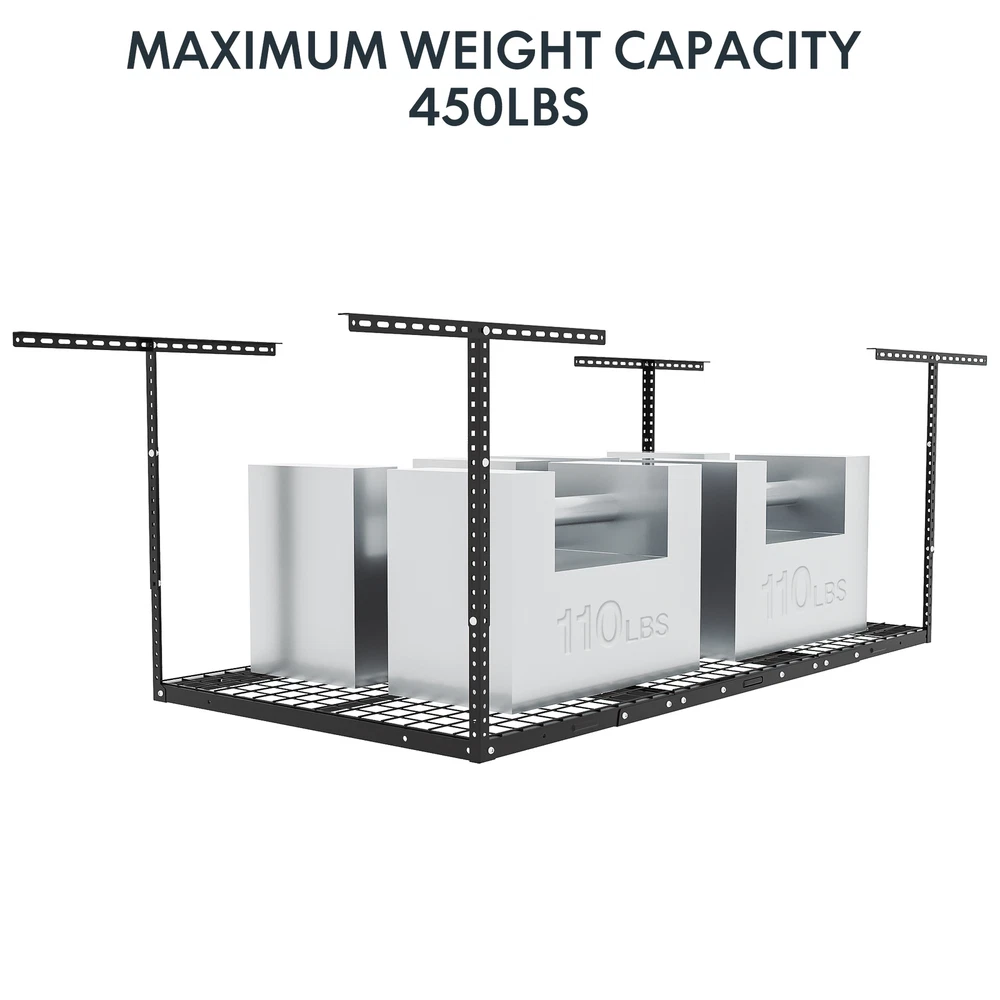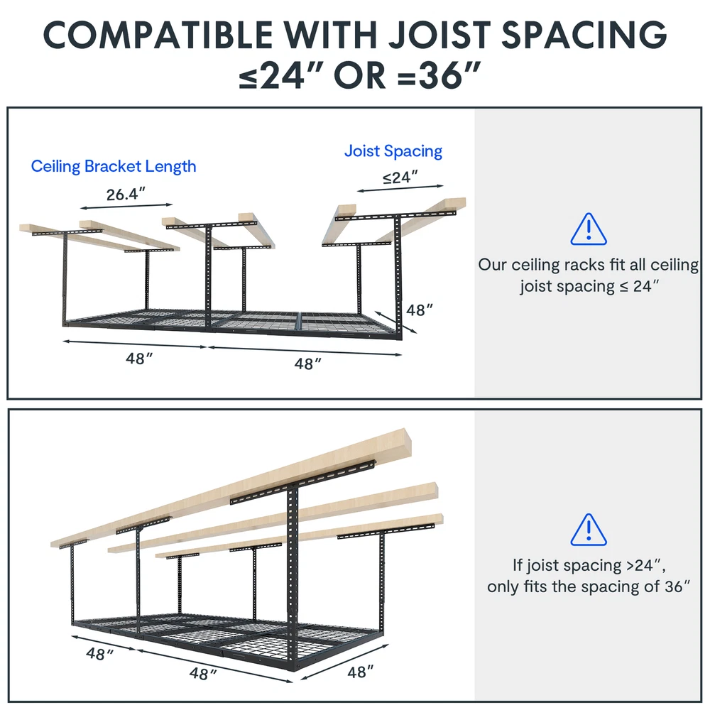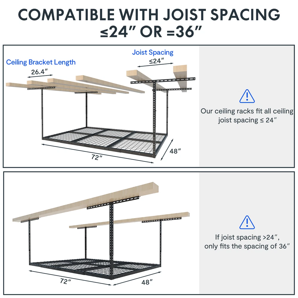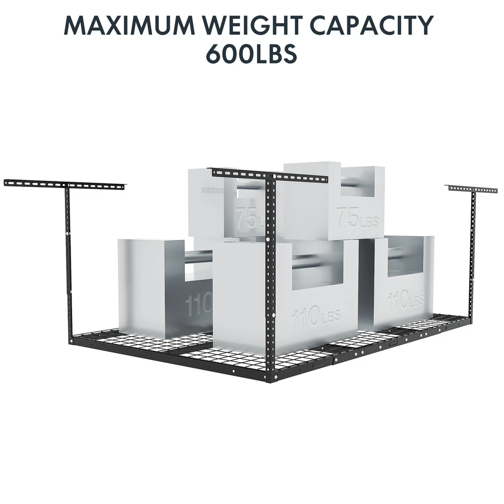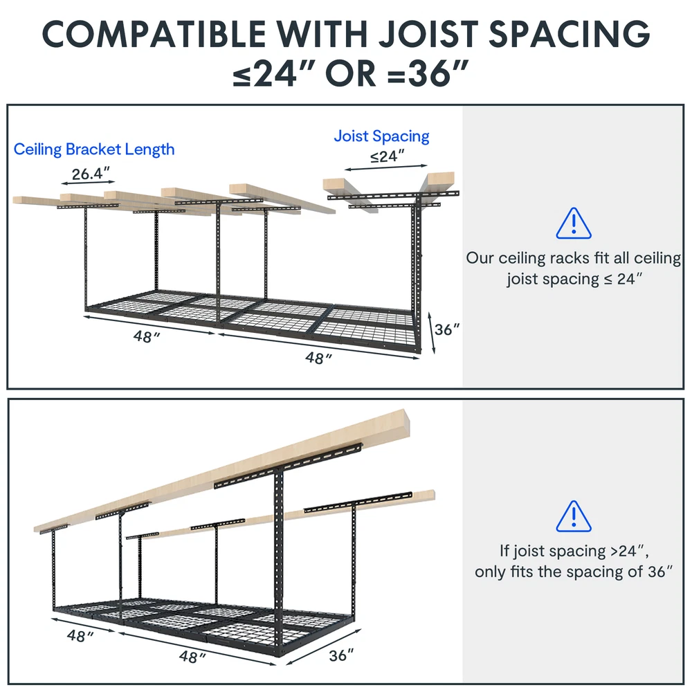 Home Payment Shipping Return Policy About Us Contact Us Feedback Title Other Standing Desk Desk Riser & Desk Converters Desk Bike Ergonomic Office Chair Fitness The STOREADY Garage Overhead Storage Rack is an ideal choice to maximize your storage space, and your garage will seem less cluttered and look more spacious. If We store things on the floor, they will become harder to find. Unless your garage is a climate-controlled room, things can get wet, dirty, or more easily come into contact with insects and rodents. Also it avoids flood damage to store your things overhead. This system is simple to set up and all the hardware and instructions needed are included in the package. A variety of size options available to purchase from STOREADY : 4'x8', 4'x6', 3'x6', 3'x8'. Avoid Water Damage by Storing Your Items off the Garage Floor. Protect your items and use garage ceiling space to store seasonal and unused items. 22'' to 40'' ceiling dropdown provides up to 105 cu. Ft. of storage. (Accessory hooks and items pictured on the racks are not included.) Strong And Secure Buy overhead racks with long ceiling brackets designed to be attached to 2 studs. Combined with 6 vertical posts, it is the optimal structure choice to ensure safety. High Quality Thicker M8 screws selected and all hardwares have gone through strict tests. Heavy duty cold-rolled steel construction provides safely loading up to 600 lbs. Integrated Grid Design More stable and sturdy compared to others with separate frame and wire. Diy Installation Installation template helps make plan. This overhead storage rack fits all ceiling joist spacing≤24", if joist spacing>24", only fits the ceiling spacing of 48". Height Adjustable The height can be adjusted from 22” – 40”, providing a convenient and safe place to store yourstuff. Important: Can NOT be mounted to metal wall. Suitable for wood studs/joists and concrete wall. Key Features: High Quality Construction – Safe and high loading capacity. Easy Installation – Step-By-Step instruction and installation template. Waterproof – Avoid water damage and store seasonal items. Different – Integrated Grid Design. One Box – Everything arrived in one box. Avoid flood damage by storing your things off the garage floor and protect your treasured items. Overhead storage makes your garage look neat,and get away from insects and rodents. Height adjustable from 22"to 40" ceiling drop-down, so you can customize to your perfect height. Size: 3x6 ft ‎ Item Weight: 41.8 Pounds Max Capacity: 450lbs Product Dimensions: 72 x 36 x 40 inches Size: 3x8 ft ‎ Item Weight: 56 Pounds Max Capacity: 600lbs Product Dimensions: 96 x 36 x 40 inches Size: 4x6 ft Item Weight: 46.7 Pounds Max Capacity: 450lbs Product Dimensions: 72 x 48 x 40 inches Size: 4x8 ft Item Weight:61.7pounds Max Capacity: 600lbs Product Dimensions: 96 x 48 x 40 inches Details: Manufacturer:‎ STOREADY Color:Black/White Material: Cold-Roll Steel Installation Type: Ceiling Style: 1-pack About us Return Policy Warranty Info Shipped About us Our Mission Make healthy life easier. To introduce creative solution geared towards creating better working environments that promote efficiency, productivity, and wellbeing. The goal is to help our clients achieve new heights of wellness and strike the perfect work-life balance through innovative and ergonomic solutions. Our Products We offer a wide range of ergonomic products for your home and office. All products are carefully engineered using the best materials to boost health and performance. Our Guarantee FlexiSpot never compromises on quality. Our products have been thoroughly tested with numerous Fatigue tests, Pressure Tests, Vibration Tests, and Temperature Tests. All of the products satisfy the most stringent qualifications around the world. Our Team We have over 600 innovative R&D engineers who imagine, design, and implement ergonomic workplace furniture solutions. Thanks to our R&D engineers, we have an impressive count of 1000 patents on record! At FlexiSpot, you’re guaranteed exceptional customer service regardless of your geographical location. Our customer service team is available 24/7 to attend to your needs all across the globe. We have numerous warehouses around the globe, including 13 in the US, guaranteeing a quick and convenient delivery experience for our customers. Return Policy General information for all returns All items must be returned in their original factory packaging and in “like new” condition. Items returned in other than “like new” condition will be subject to a 10% restocking fee. The restocking fee will be deducted from your refund. A Return Merchandise Authorization (RMA) number is required for all returns. Returns are processed and credited within 7 to 10 days of receipt. Returned items are subject to inspection prior to issuing a refund. You’ll be responsible for shipping the products to the return address provided with the RMA number. All returned items must be disassembled and repackaged as they were originally received. Items not returned in this condition may be subject to additional fees. We strongly suggest using a traceable and insurable shipping method when making your return. We are not responsible for returns lost or damaged in transit. 30-day risk-free policy You are free to return any item within 30 days of receipt. A 30-day risk-free policy applies to all items. No restocking fee is applied for items returned in “ like new ” condition. No shipping fee is applied for the return of the item. The 30-day risk-free policy is only for orders within the continental United States. Return after 30 days of receipt You are also free to return any item after 30 days of receipt. We want you to be completely satisfied with your FlexiSpot purchase, and we strive to provide expert guidance to help you choose the best possible products for your needs. We also understand that sometimes a product just doesn’t quite fit. That is why we ma