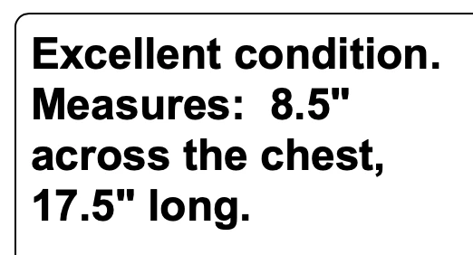 Excellent condition. Measures: 8.5" across the chest, 17.5" long. We are so thankful for our customers! We have thousands of listings, and therefore receive hundreds of messages, every single day. So, if you are asking about a price drop, or a shipping price drop, or asking for extra measurements, or to add additional photos, please allow me to answer you here, No thanks. If your question is not one of those questions, we will be happy to answer you individually. YES...WE DO COMBINE DOMESTIC SHIPPING. Extra jewelry items ship for $2 each (except for large jewelry lots). We will refund the difference as we are mailing out.....we hope you enjoy shopping with us!