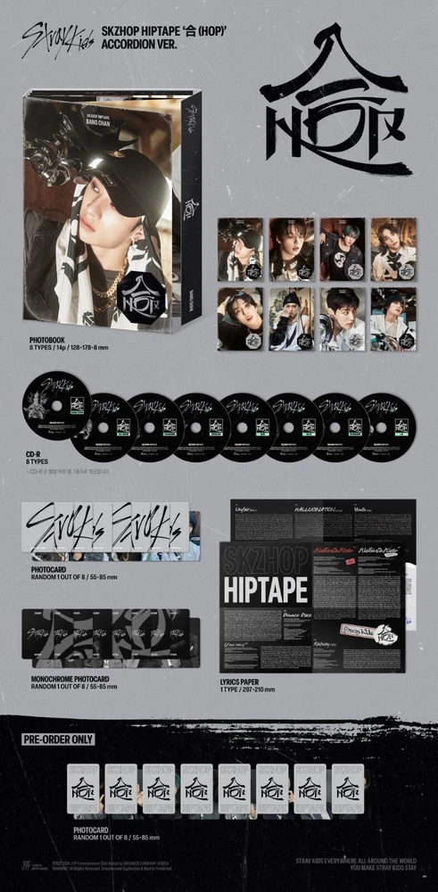 STRAY KIDS SKZ SKZHOP HIPTAPE 合 (HOP) Official Sealed Album Accordion Ver. set (Pre-Order ver.) This is 100% authentic, official item. Official + Sealed SEALED ALBUM ACCORDION VER. Contents: Photobook + 8 CD-Rs + 1 Random Photocard out of 8 + 1 Random Black and White Photocard out of 8 + 1 Lyric Paper - Pre-order Benefit: 1) 1 Random Photocard out of 8 Pre-Order Ver. Benefit [O] Record company Pre-Order Benefit [X] πŸ“¦ Shipping & Handling πŸ“¦ Please check the shipping address one more time before ordering! Returns or misdelivery due to incorrect shipping address are not eligible for refund. Standard shipping : Tracking number provide (7-25 Business Days) - US, Canada, Europe ( France, Germany, Spain, United Kingdom ) , Asia ( China, Hong Ko ng, Indonesia, Japan, Korea, South, Malaysia, Philippines, Russian Federation, Singapore, Taiwan, Thailand, Vietnam) , Australia, New Zealand , Brazil Economy shipping : Tracking number provide, Sign is required when receiving the package ! (10-40 Business Days) - Asia : Armenia, Azerbaijan Republic, Bahrain, Bangladesh, Bhutan, Cambodia, Georgia, India, Jordan, Kazakhstan, Maldives, Mongolia, Nepal, Pakistan Qatar, Saudi Arabia, Sri Lanka, United Arab Emirates, Uzbekistan - Southeast Asia : Cambodia - North America : Mexico - South America : Argentina, Chile, Colombia, Ecuador, Peru - Europe : Austria, Belgium, Bulgaria, Croatia, Republic of, Czech Republic, Denmark, Finland, Greece, Hungary, Italy, Luxembourg, Moldova, Netherlands, Norway, Poland, Portugal, Romania, San Marino, Slovakia, Slovenia, Sweden, Switzerland, Ukraine - Middle East : Bahrain, Jordan, Qatar, Saudi Arabia, Turkey, United Arab Emirates Shipping to these countries requires your signature when you receive the package. You need to sign and receive it. We are not responsible for any delivery accidents caused by this. πŸ“’ International Shipments We are not responsible for any custom duty or import tax. πŸ“’ RETURN POLICY We do quality check before sending out items. Only if you received defective products, please return within 30 days from the date you received the item and we will replace them for you. Buyers are responsible for shipping and handling fees on return items under any circumstances. Please notify us before sending back items. We'll answer your inquiries within 24 hrs. ully packed your purchase item Standard shipping : Tracking number provide [ RETURN POLICY ] We do quality check before sending out items. Only if you received defective products, please return within 30 days from the date you received the item and we will replace them for you. Buyers are responsible for shipping and handling fees on return items under any circumstances. Please notify us before sending back items. [ OTHER POLICIES ] We are not responsible for any custom duty or import tax. We'll answer your inquiries within 24 hrs.