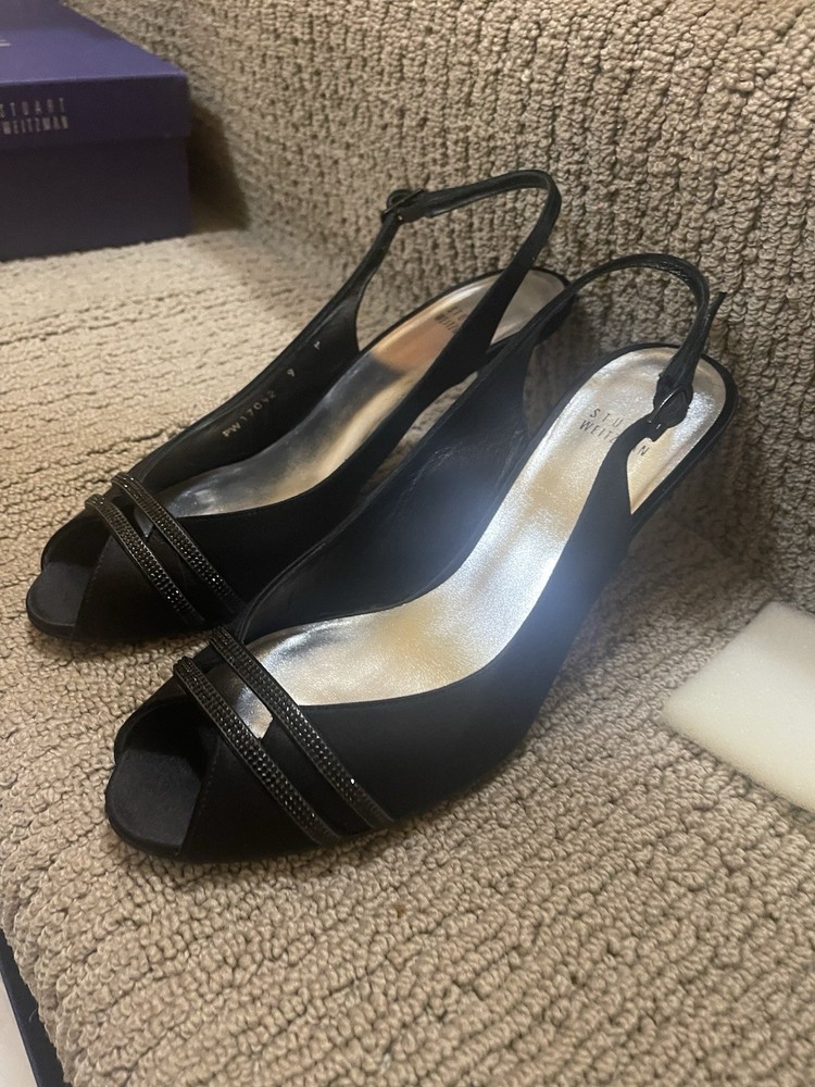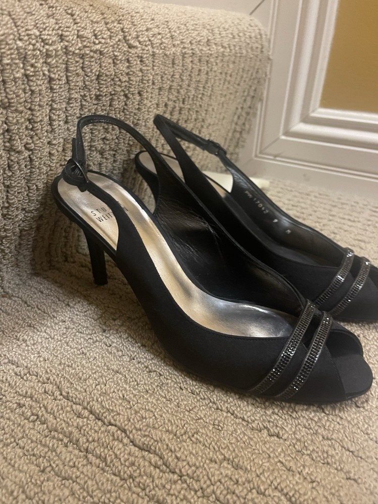 STUART WEITZMAN 7Black Satin Peep Toe Sling Back Pumps Diamond New