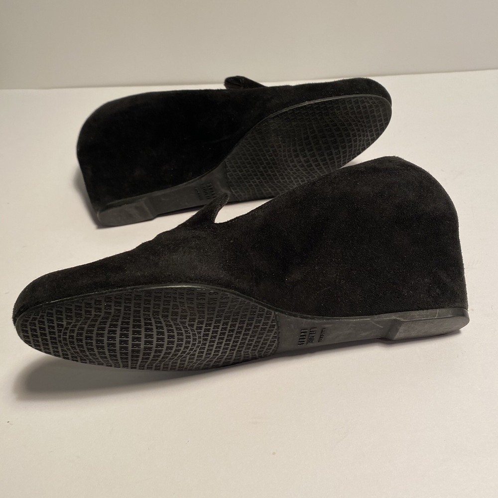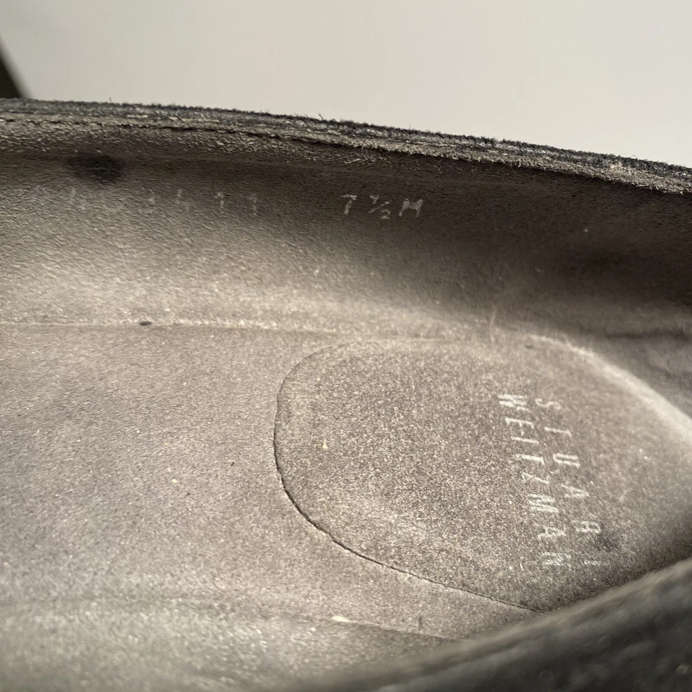 STUART WEITZMAN Black Suede ARISE Wedge Heel Court Shoe US Size 7.5 This pre-owned item is in excellent condition, exhibiting little to no signs of wear. The STUART WEITZMAN Black Suede ARISE Wedge Heel Court Shoe in US Size 7.5 is a stylish and sophisticated choice for women. Featuring an almond toe shape and slip-on closure, this high heel court shoe is made of black suede with a leather insole for added comfort. The wedge heel design adds a touch of elegance, making it a versatile option for both casual and formal occasions. Fast responses to any questions you may have. If you encounter any issues with your purchase, please know that returns are accepted.