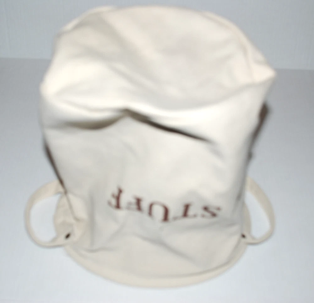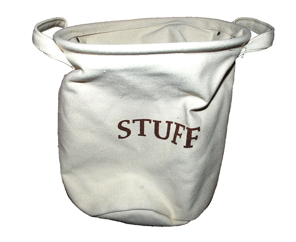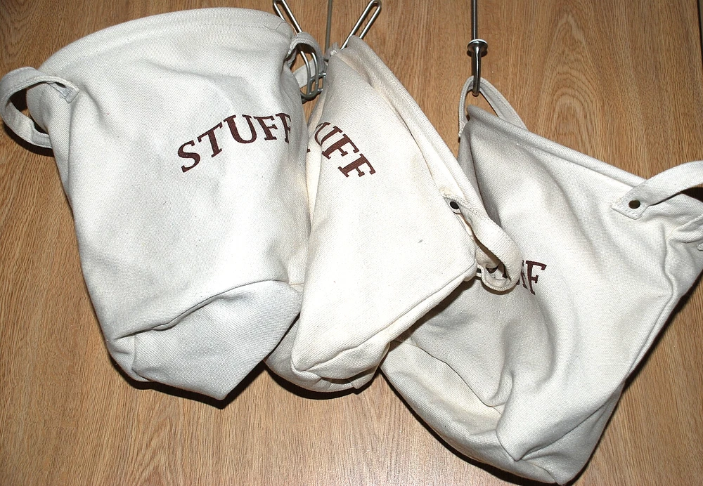 STUFF Utility Canvas Carry Bags With Handles Organizing Storage Totes Lot of 3. They each measure 11" tall by 10" wide by 9" deep. Add practical functionality to your space with this Lot of 3 Vintage STUFF Utility Canvas Carry Bags . These sturdy, classic totes are made of durable canvas material, featuring reinforced handles and a spacious, open-top design perfect for everyday storage and organization. Whether you’re tidying up craft supplies, tools, books, or pantry goods, these bags offer both style and substance. Each bag is marked with bold “STUFF” lettering on the front, lending a playful yet vintage industrial vibe. Great for home, garage, car trunk, or office use. Features: Lot of 3 matching canvas utility bags Sturdy canvas construction with reinforced stitching Dual carry handles for easy transport Printed with bold “STUFF” text for a retro look Ideal for storage, organizing, transporting items Vintage aesthetic with authentic wear and character Approximate Dimensions (each bag): 11" tall by 10" wide by 9" deep. Perfect for lovers of rustic décor, vintage storage solutions, or anyone looking to add character and function to their organizing game. Cosmetically, the carrying bags are in very nice pre owned condition with no rips or tears. They're very sturdy and clean. Overall, they're really nice with very minimal signs of age marks or spots.