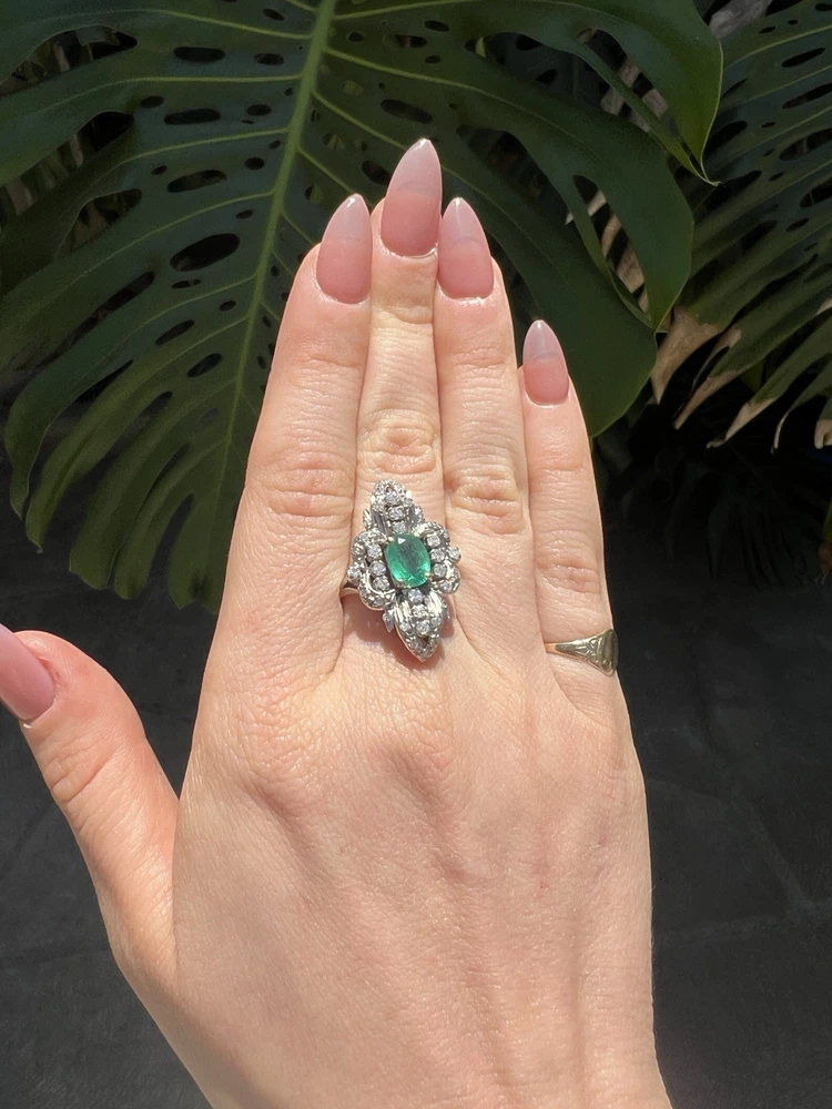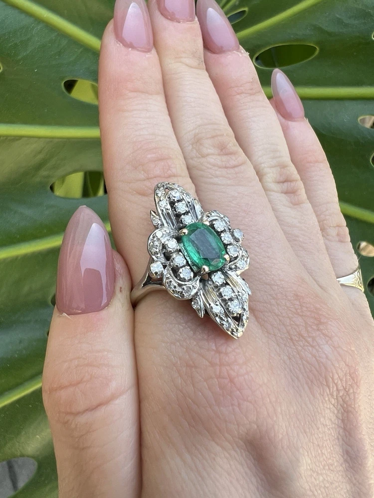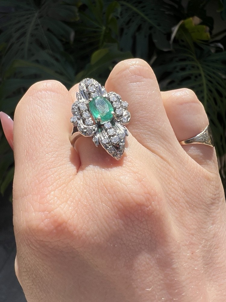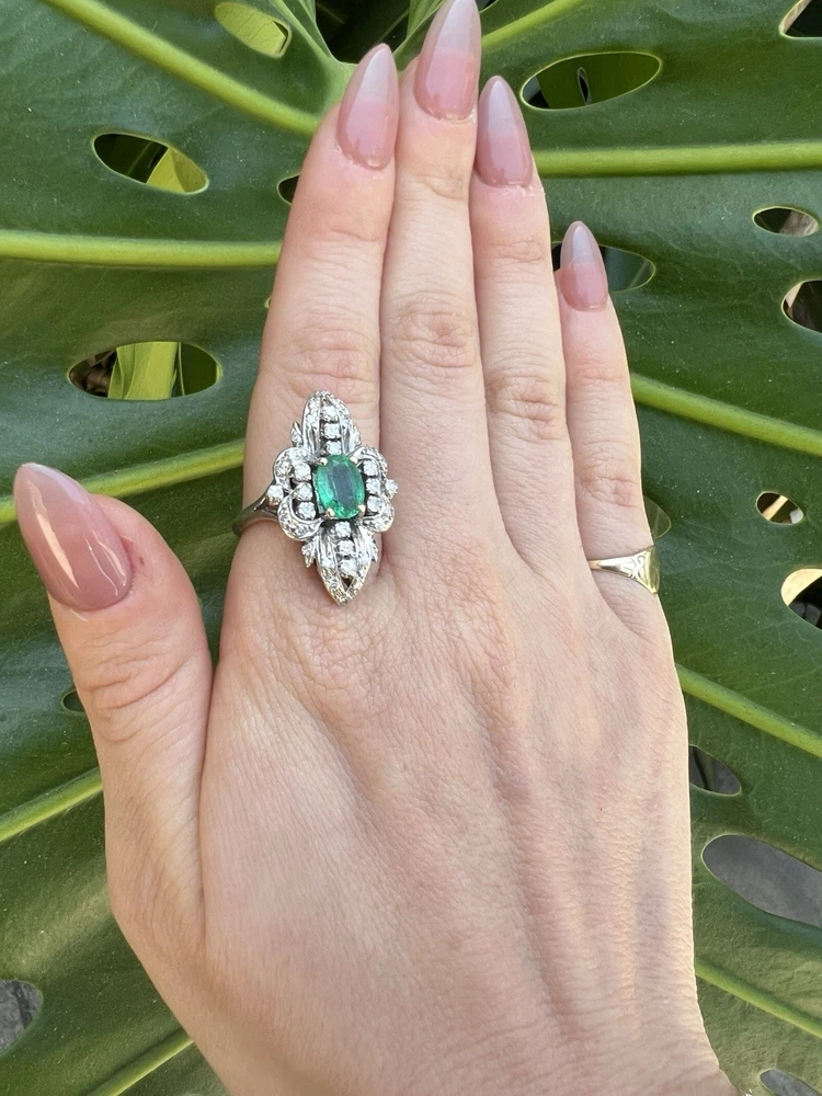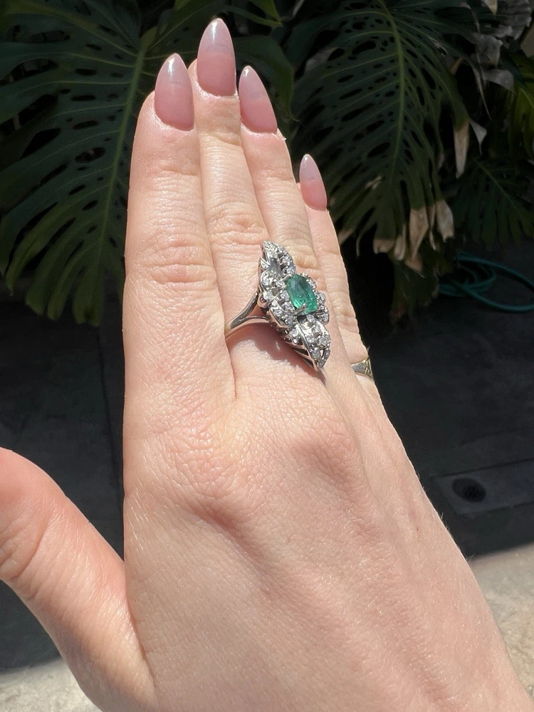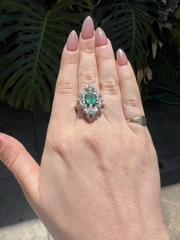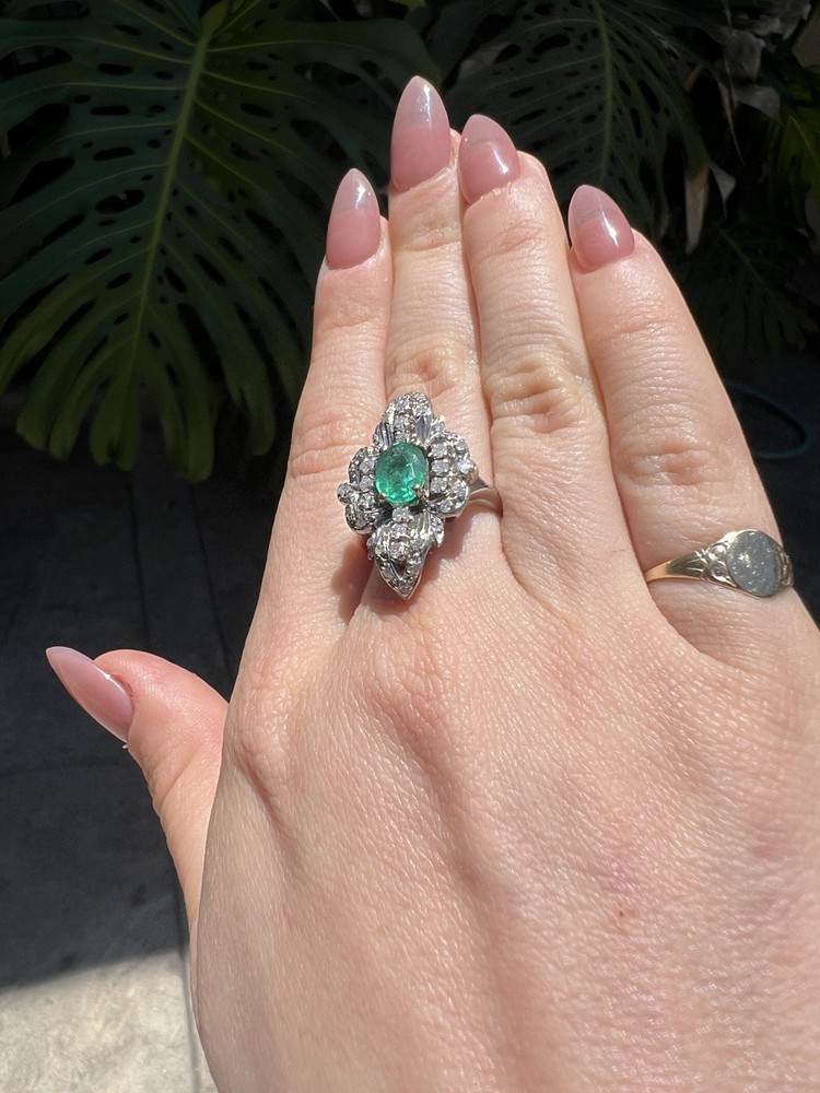 GLAMOROUS antique emerald and diamond ring 14k white gold, size 6.75 US, 7.25 grams, approx 1 ct natural emerald (likely Colombian based on the color), 14 1pt natural diamonds, 22 diamond chips. The ring face is 3 cm long and 2.8 cm wide. This ring is quite the centerpiece. It is SO elegant yet SO dramatic its almost a wonder how both those words can be used to describe any one thing. The bright stones and the knuckle-to-knuckle design makes this ring the center of attention! The shape of the ring face is "navette" which translates from French to mean "little boat" as the oval design comes to a point on the top and bottom of the ring like a little boat. This style is very flattering and elongating to the finger/hand. I originally purchased the ring in the UK but there are maker's marks on the outside of the band (pictured in last two photos) which hint at French origins. I've tried to google image search the marks but have not gotten much clarity - if you know what they mean I'd love to learn! As a collector, this ring is a dream! SO much charm, character, beauty, and f inger coverage with all natural stones and fine craftsmanship. This investment piece is also a dream gift! Emerald is the birthstone for May and diamond is the birthstone for April. Please let me know if you have any questions! Frannie :)