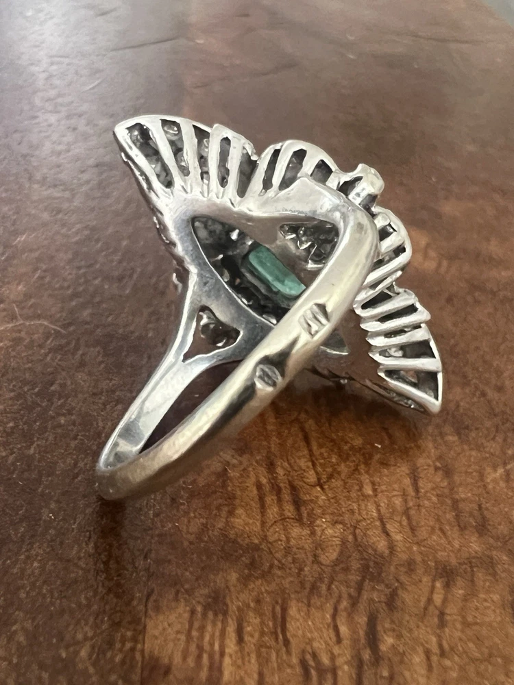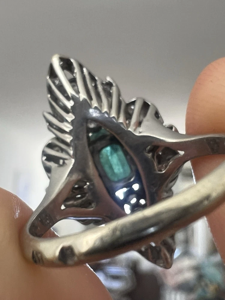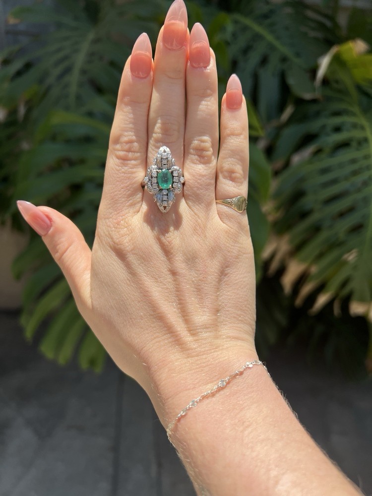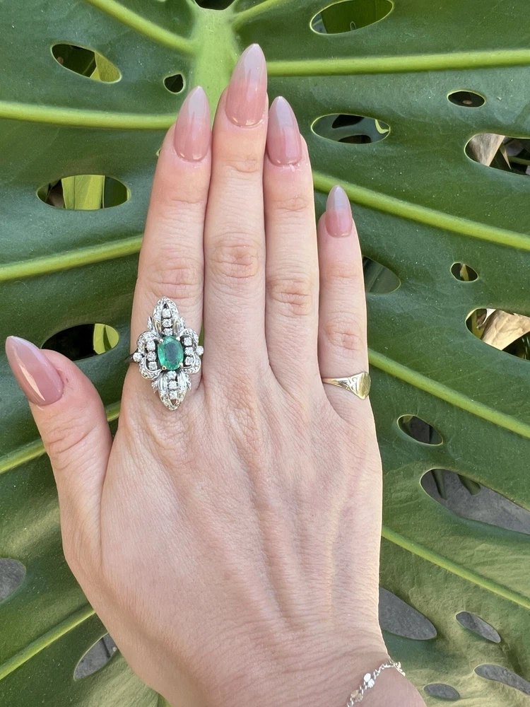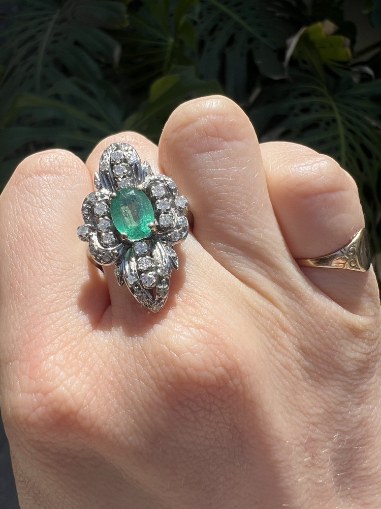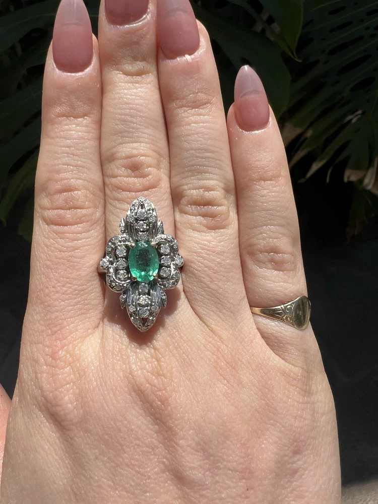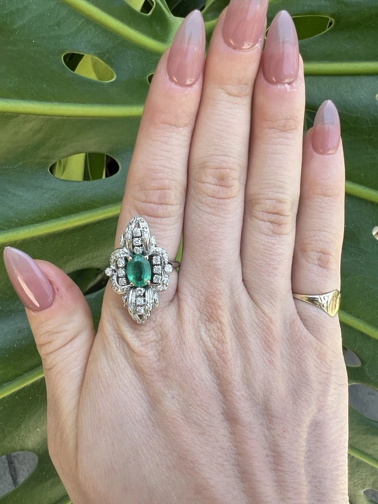 GLAMOROUS antique emerald and diamond ring 14k white gold, size 6.75 US, 7.25 grams, approx 1 ct natural emerald (likely Colombian based on the color), 14 1pt natural diamonds, 22 diamond chips. The ring face is 3 cm long and 2.8 cm wide. This ring is quite the centerpiece. It is SO elegant yet SO dramatic its almost a wonder how both those words can be used to describe any one thing. The bright stones and the knuckle-to-knuckle design makes this ring the center of attention! The shape of the ring face is "navette" which translates from French to mean "little boat" as the oval design comes to a point on the top and bottom of the ring like a little boat. This style is very flattering and elongating to the finger/hand. I originally purchased the ring in the UK but there are maker's marks on the outside of the band (pictured in last two photos) which hint at French origins. I've tried to google image search the marks but have not gotten much clarity - if you know what they mean I'd love to learn! As a collector, this ring is a dream! SO much charm, character, beauty, and f inger coverage with all natural stones and fine craftsmanship. This investment piece is also a dream gift! Emerald is the birthstone for May and diamond is the birthstone for April. Please let me know if you have any questions! Frannie :)