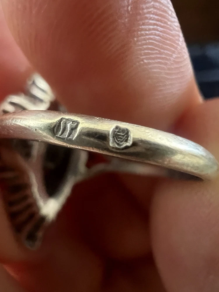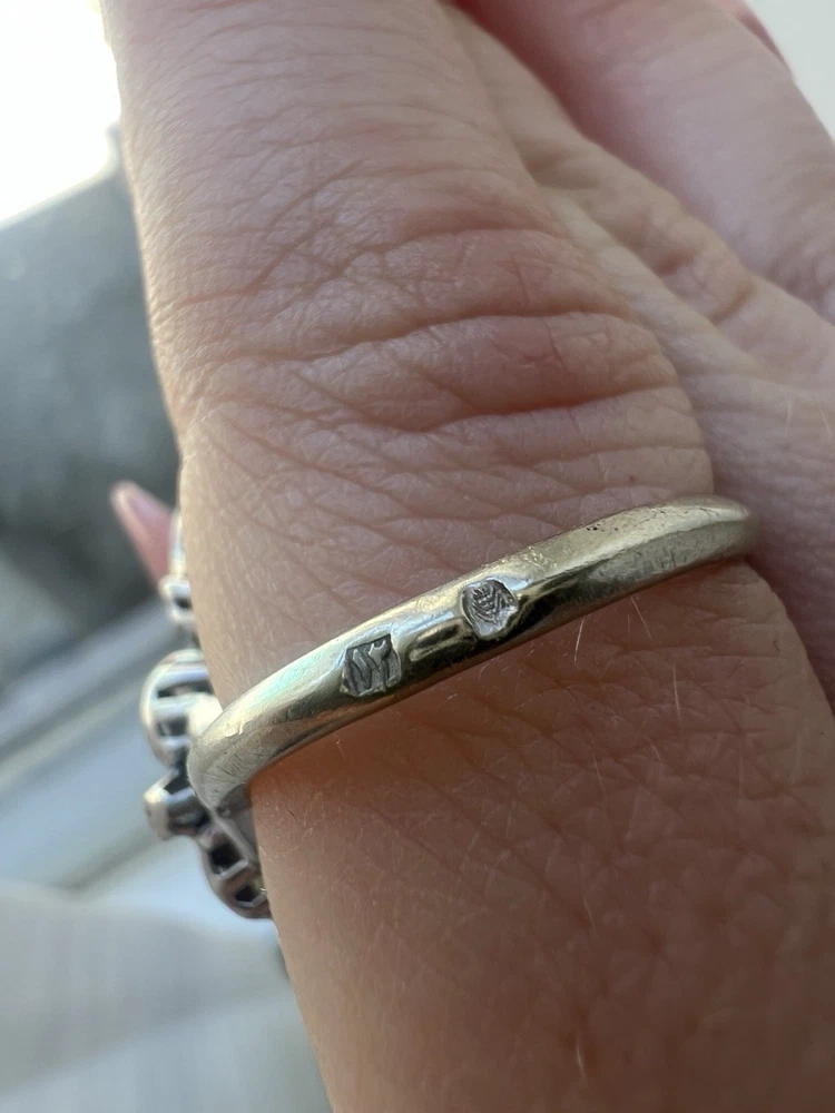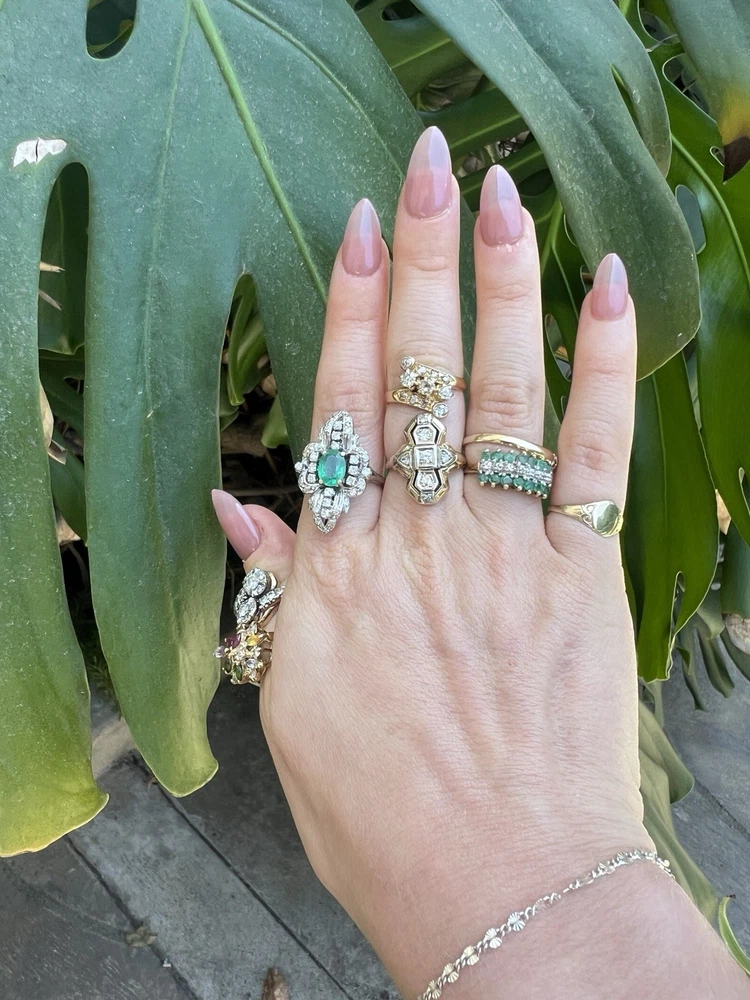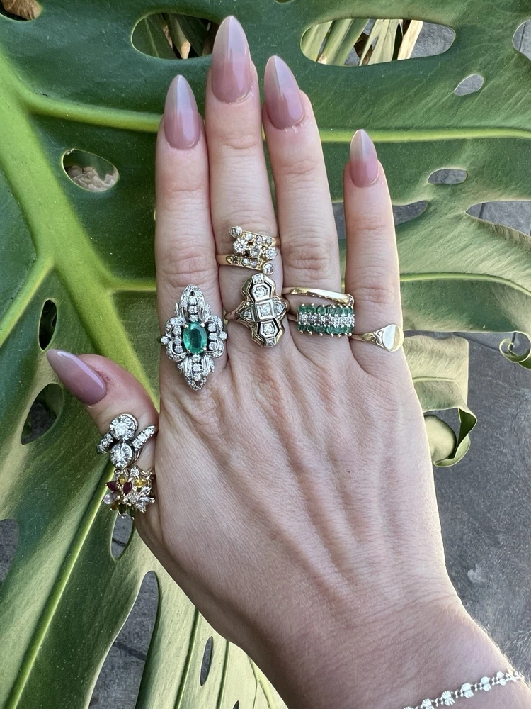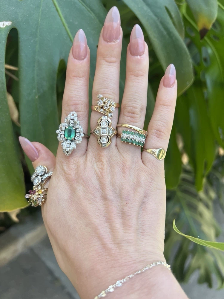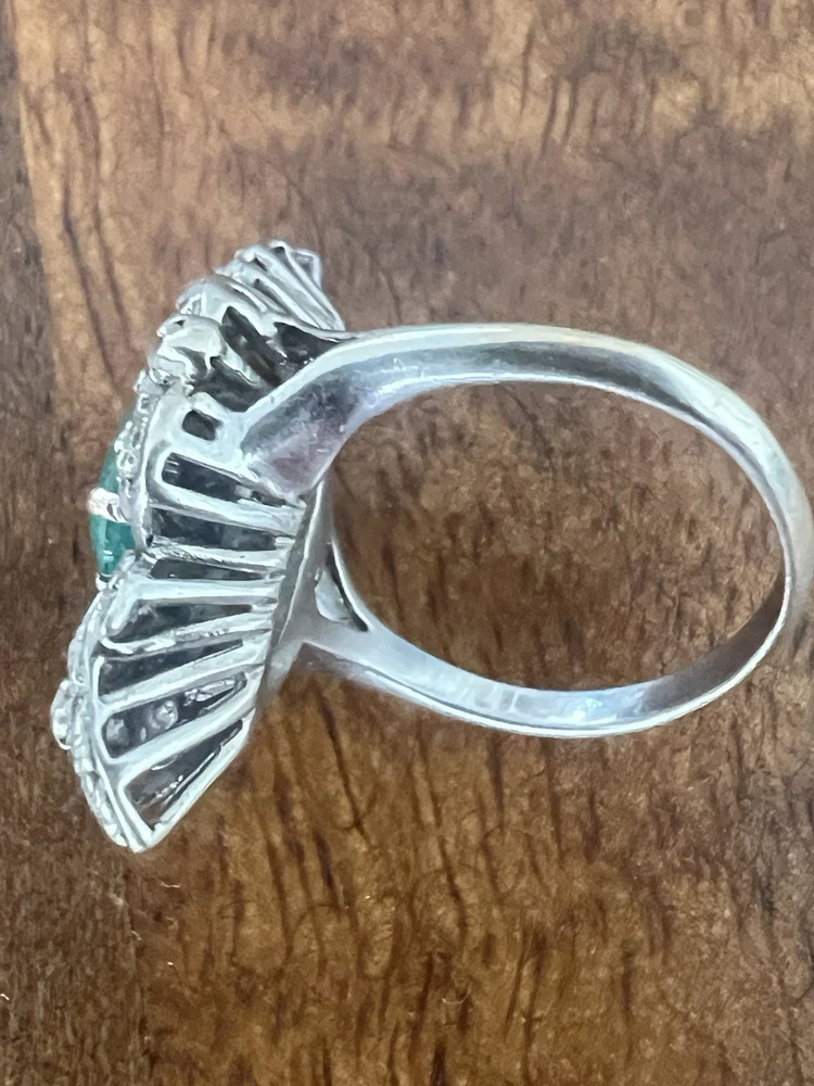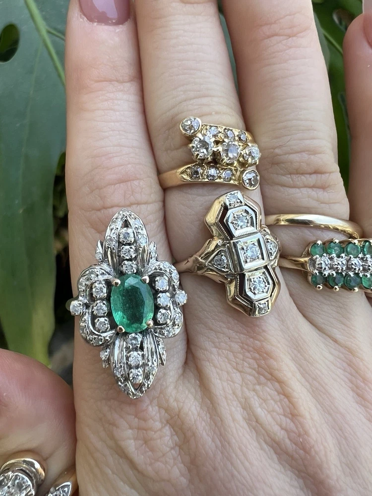 GLAMOROUS antique emerald and diamond ring 14k white gold, size 6.75 US, 7.25 grams, approx 1 ct natural emerald (likely Colombian based on the color), 14 1pt natural diamonds, 22 diamond chips. The ring face is 3 cm long and 2.8 cm wide. This ring is quite the centerpiece. It is SO elegant yet SO dramatic its almost a wonder how both those words can be used to describe any one thing. The bright stones and the knuckle-to-knuckle design makes this ring the center of attention! The shape of the ring face is "navette" which translates from French to mean "little boat" as the oval design comes to a point on the top and bottom of the ring like a little boat. This style is very flattering and elongating to the finger/hand. I originally purchased the ring in the UK but there are maker's marks on the outside of the band (pictured in last two photos) which hint at French origins. I've tried to google image search the marks but have not gotten much clarity - if you know what they mean I'd love to learn! As a collector, this ring is a dream! SO much charm, character, beauty, and f inger coverage with all natural stones and fine craftsmanship. This investment piece is also a dream gift! Emerald is the birthstone for May and diamond is the birthstone for April. Please let me know if you have any questions! Frannie :)