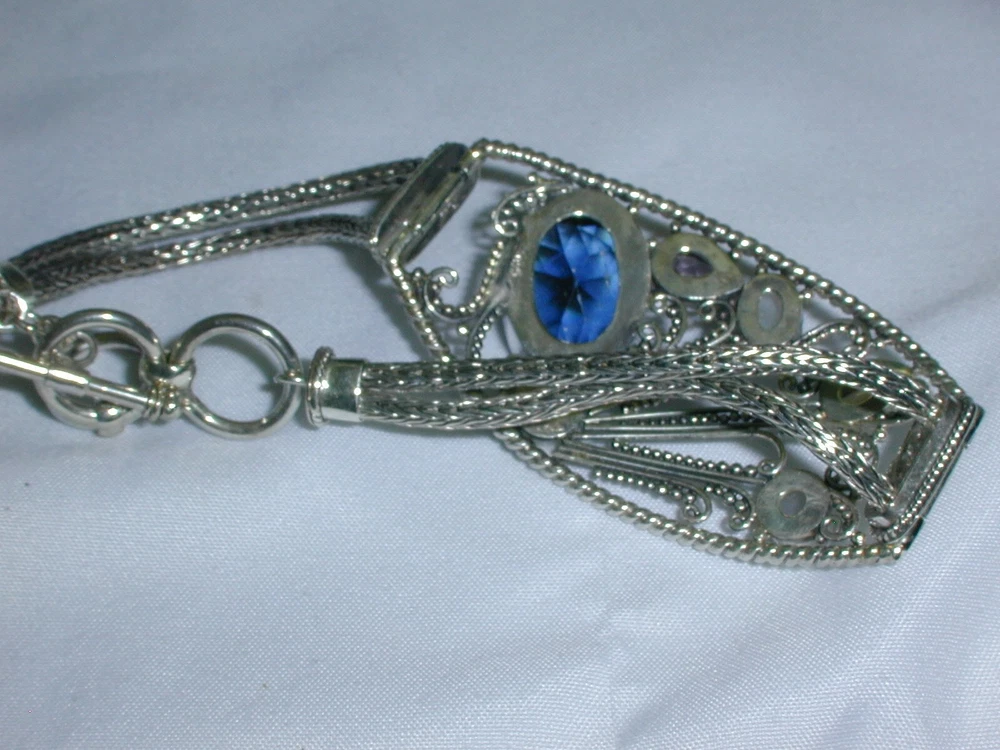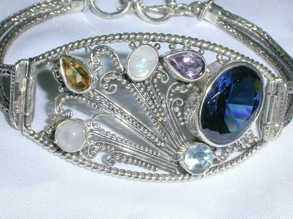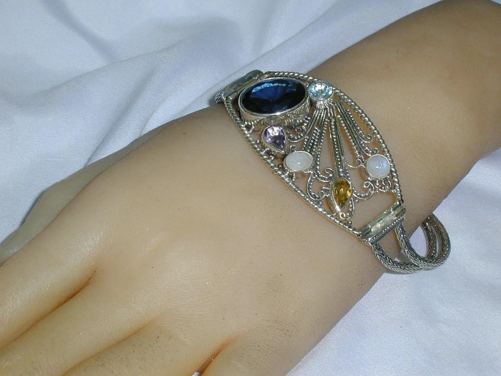 Add a touch of exotic elegance to your wardrobe with this stunning Bali bracelet. Crafted from bold sterling silver, this bracelet features a beautiful chain style adorned with A large sparkling blue quartz gemstone- plus topaz, Moonestones, Amethyst and Citrine sotnes. The bracelet is 7 3/4" to 8 3/4" long and is perfect for any occasion. The piece is made with 925 metal purity and is a wonderful addition to any fine jewelry collection. The bracelet's unique style and design reflect the beauty of Bali, making it a must-have for anyone who loves exotic fashion. Don't miss out on the opportunity to add this beautiful bracelet to your collection. DESCRIPTION: Hallmarked: 925 Weight: 28.67 Grams Width: 1 1/4" wide by 2 3/8" across the Centerpiece the band has a double chain and a toggle clasp Length: Can be worn from 7 3/4 to 8 3/4" long It looks just stunning on the Wrist! Free US domestic shipping , international shipping is available at actual first class rates. Please see my other listings for more great jewelry.